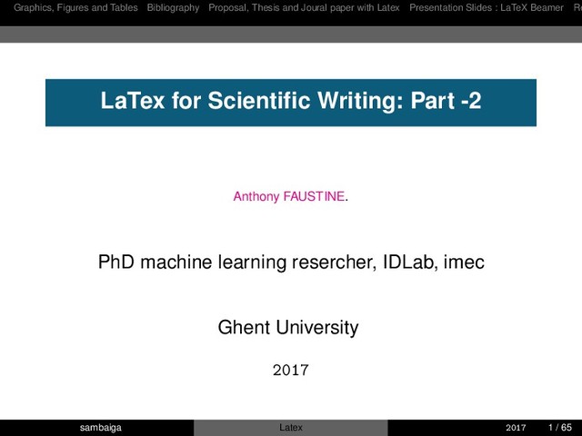 with Latex Presentation Slides : LaTeX Beamer Ré Bibliography The BibTEX Format The generic form of a BibTEX entry is @INPROCEEDINGS{Pantic2006, author={M. Pantic and R. Zwitserloot}, booktitle={Proceedings. Frontiers in Education. 36th Annual Conference}, title={Active Learning of Introductory Machine Learning}, year={2006}, pages={1-6}, doi={10.1109/FIE.2006.322738}, ISSN={0190-5848}, month={Oct},} sambaiga Latex 2017 28 / 65