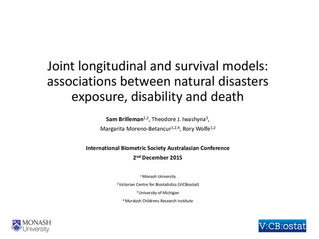 Joint modelling of longitudinal and survival (time-to-event) data has received significant attention in recent years, however much of the literature in this area has been methodological in nature. The use of joint models in applied research has been somewhat less evident. In this study we used a joint modelling approach to investigate the association between individual-level exposures to a natural disaster such as winter storm, flood, etc. and subsequent changes to physical disability, whilst accounting for non-random dropout due to death. Data for the study was based on a linked dataset containing 27,790 individuals who were interviewed at least once between 1st January 2000 and 1st December 2010 as part of the longitudinal ‘Health and Retirement Study’ in the United States. Disability was assessed using activities of daily living, measured on a discrete 12-point scale. Individual-level exposure to a natural disaster was identified at the county-level based on disaster funding received from the Federal Emergency Management Agency. Our joint model consisted of two submodels: (i) a negative-binomial mixed effects model with a log-link function for modelling the repeatedly measured disability scores and (ii) a proportional hazards model for time to death. The association between the two submodels can then be parameterised in various ways. We investigate the association between disaster exposure and disability using a time-varying exposure covariate which can be included in either one or both of the submodels. We fit the joint models using a Bayesian approach, since this provides the greatest flexibility.