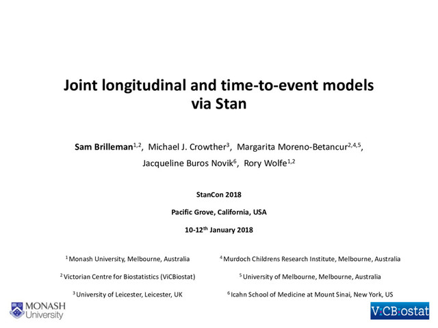 J. Crowther3, Margarita Moreno-Betancur2,4,5, Jacqueline Buros Novik6, Rory Wolfe1,2 StanCon 2018 Pacific Grove, California, USA 10-12th January 2018 1 Monash University, Melbourne, Australia 2 Victorian Centre for Biostatistics (ViCBiostat) 3 University of Leicester, Leicester, UK 4 Murdoch Childrens Research Institute, Melbourne, Australia 5 University of Melbourne, Melbourne, Australia 6 Icahn School of Medicine at Mount Sinai, New York, US