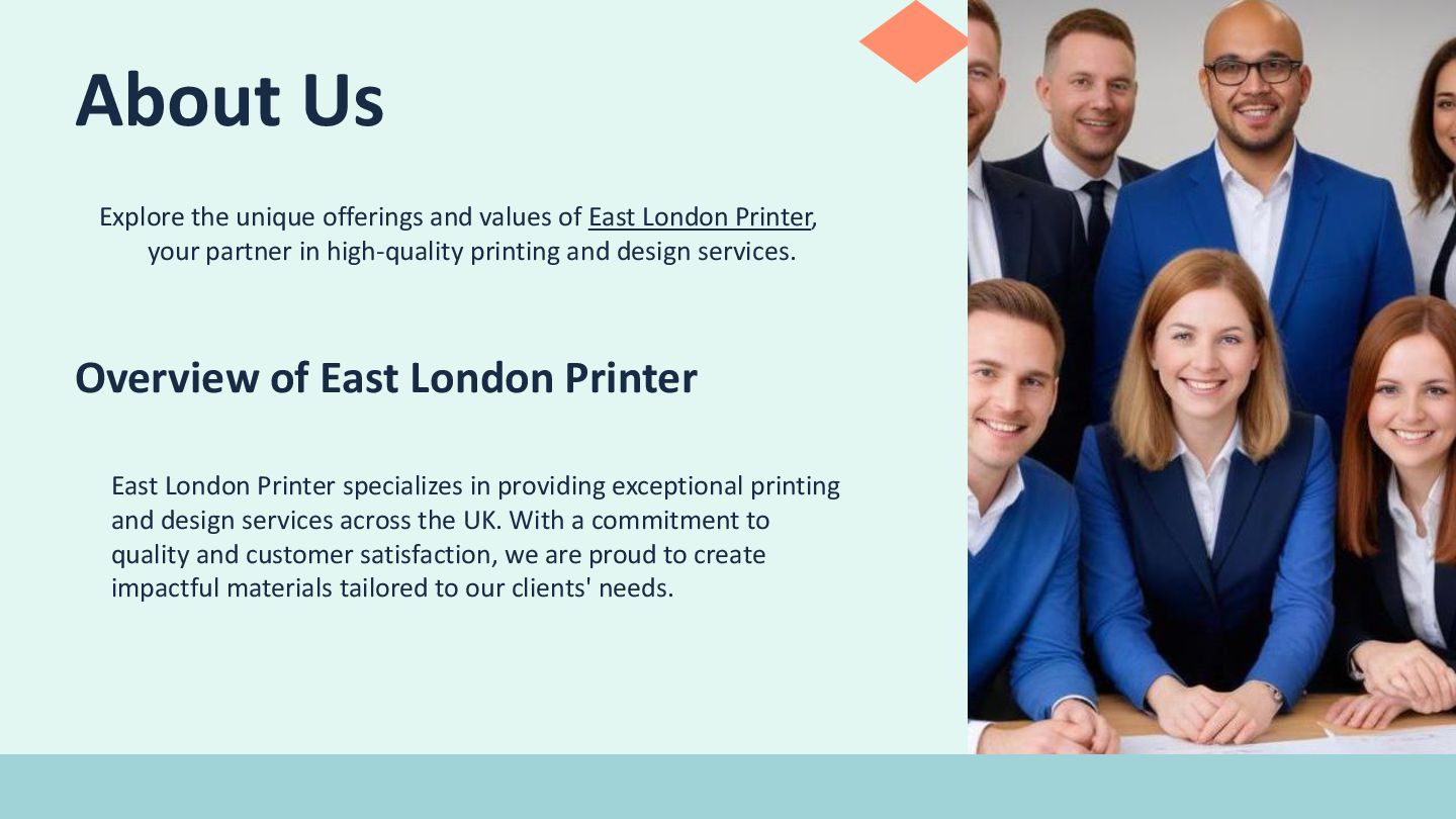 London Printer, your partner in high-quality printing and design services. Overview of East London Printer East London Printer specializes in providing exceptional printing and design services across the UK. With a commitment to quality and customer satisfaction, we are proud to create impactful materials tailored to our clients' needs.
