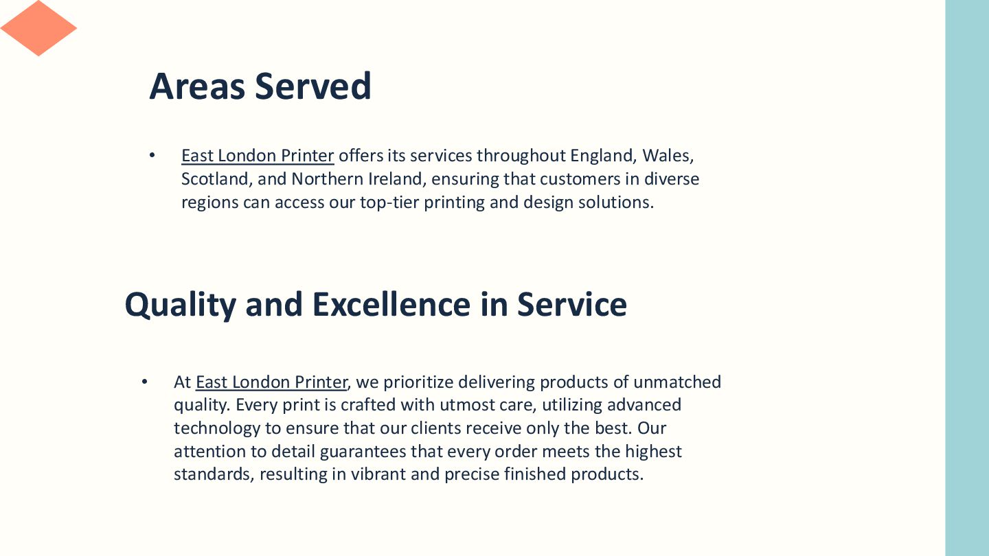 England, Wales, Scotland, and Northern Ireland, ensuring that customers in diverse regions can access our top-tier printing and design solutions. Quality and Excellence in Service • At East London Printer, we prioritize delivering products of unmatched quality. Every print is crafted with utmost care, utilizing advanced technology to ensure that our clients receive only the best. Our attention to detail guarantees that every order meets the highest standards, resulting in vibrant and precise finished products.