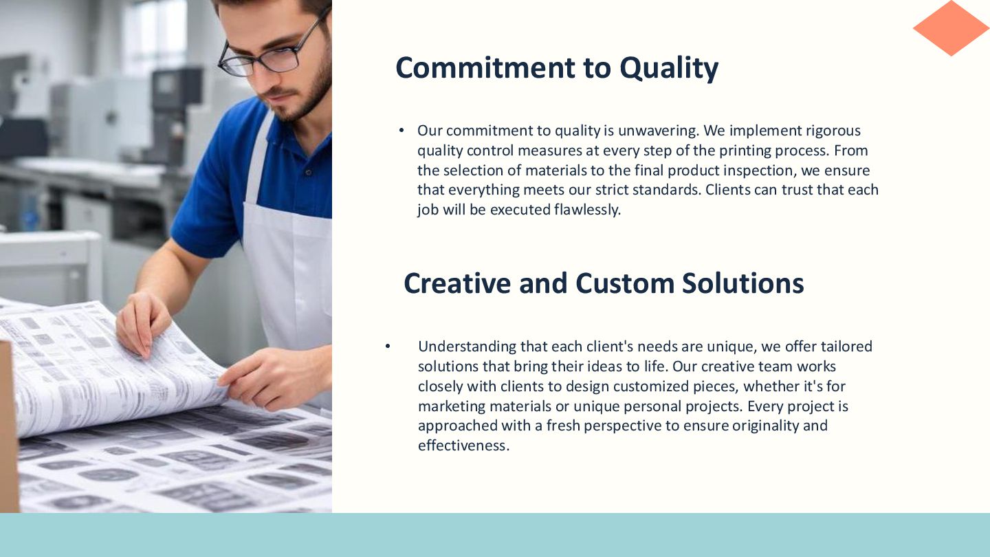 We implement rigorous quality control measures at every step of the printing process. From the selection of materials to the final product inspection, we ensure that everything meets our strict standards. Clients can trust that each job will be executed flawlessly. Creative and Custom Solutions • Understanding that each client's needs are unique, we offer tailored solutions that bring their ideas to life. Our creative team works closely with clients to design customized pieces, whether it's for marketing materials or unique personal projects. Every project is approached with a fresh perspective to ensure originality and effectiveness.