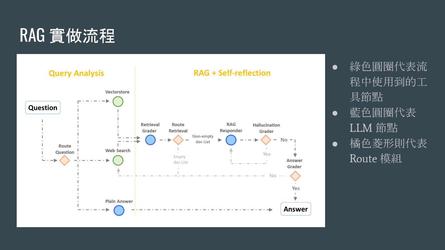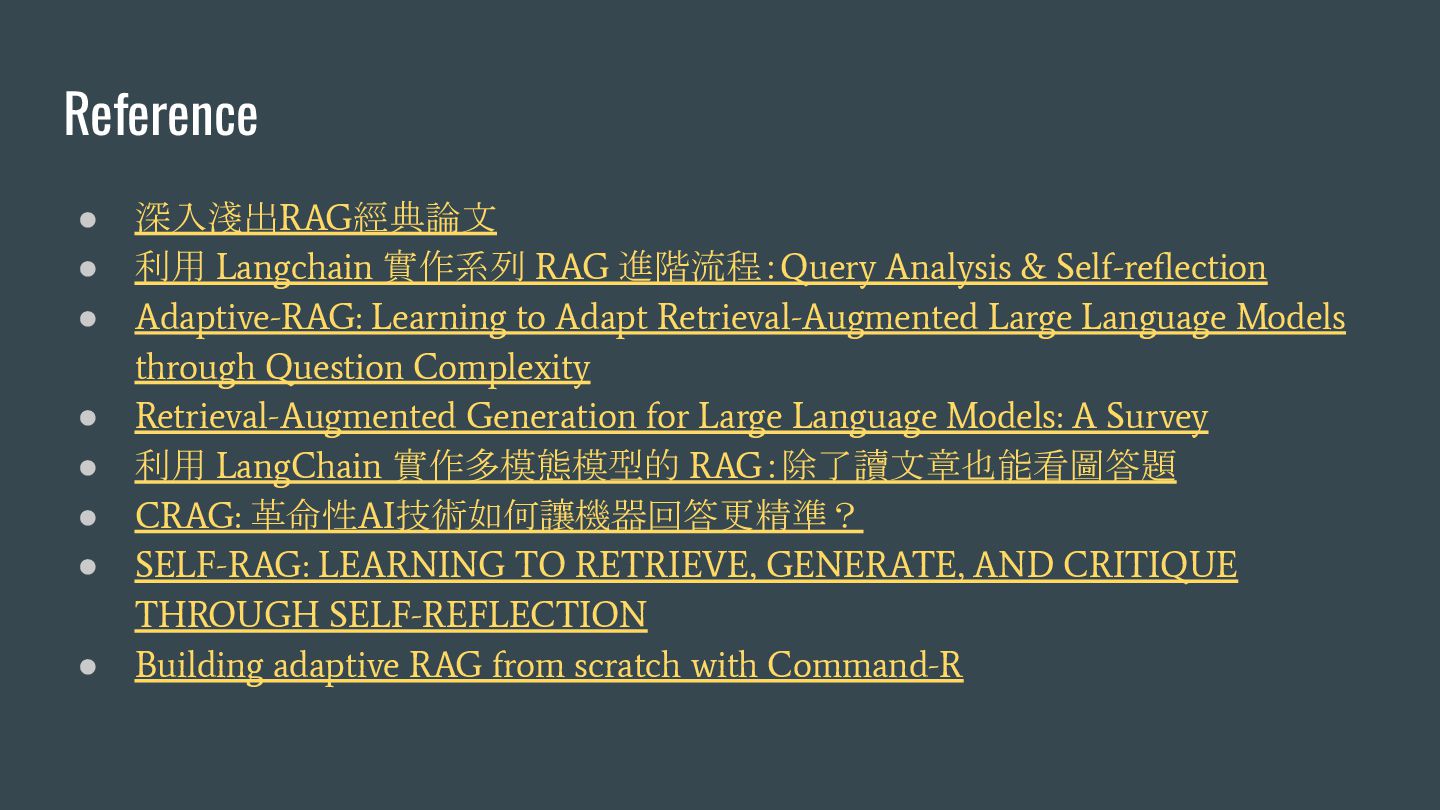 & Self-reflection • Adaptive-RAG: Learning to Adapt Retrieval-Augmented Large Language Models through Question Complexity • Retrieval-Augmented Generation for Large Language Models: A Survey • 利用 LangChain 實作多模態模型的 RAG:除了讀文章也能看圖答題 • CRAG: 革命性AI技術如何讓機器回答更精準? • SELF-RAG: LEARNING TO RETRIEVE, GENERATE, AND CRITIQUE THROUGH SELF-REFLECTION • Building adaptive RAG from scratch with Command-R
