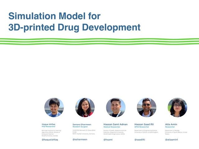 School of Computer Science McGill University, Canada @haqueishfaq Samara Sharmeen Resident Surgeon VIVANTES Netzwerk für Gesundheit GmbH RWTH Aachen University, Germany @ssharmeen Hassan Sami Adnan Medical Researcher Faculty of Health, Medicine and Life Sciences, Maastricht University World Health Organization (WHO) @hsami Hassan Saad Ifti DPhil Researcher Department of Engineering Science University of Oxford, United Kingdom @saadifti Atia Amin Researcher Department of Biology University of South Dakota, United States @atiaamin1 Simulation Model for 3D-printed Drug Development