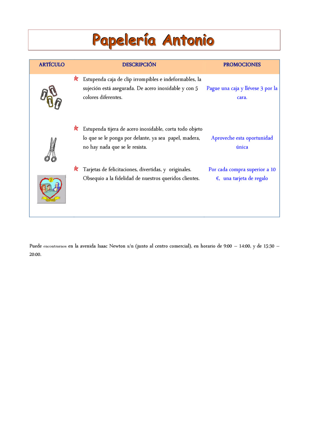 le e er r rí í ía a a A A An n nt t to o on n ni i io o o ARTÍCULO DESCRIPCIÓN PROMOCIONES Estupenda caja de clip irrompibles e indeformables, la sujeción está asegurada. De acero inoxidable y con 5 colores diferentes. Pague una caja y llévese 3 por la cara. Estupenda tijera de acero inoxidable, corta todo objeto lo que se le ponga por delante, ya sea papel, madera, no hay nada que se le resista. Aproveche esta oportunidad única Tarjetas de felicitaciones, divertidas, y originales. Obsequio a la fidelidad de nuestros queridos clientes. Por cada compra superior a 10 €, una tarjeta de regalo Puede encontrarnos en la avenida Isaac Newton s/n (junto al centro comercial), en horario de 9:00 – 14:00, y de 15:30 – 20:00.