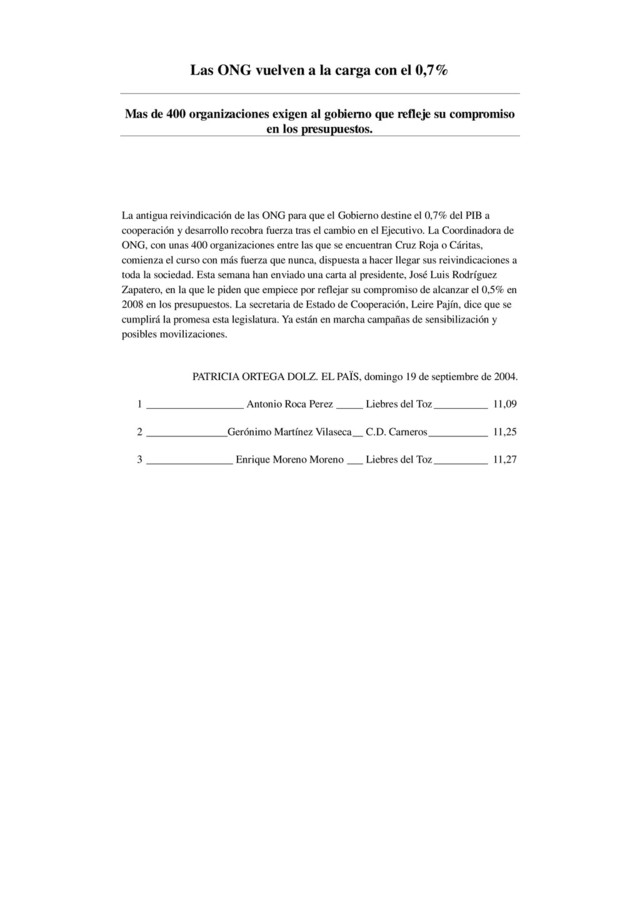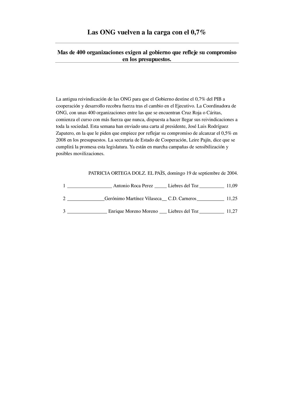 de 400 organizaciones exigen al gobierno que refleje su compromiso en los presupuestos. La antigua reivindicación de las ONG para que el Gobierno destine el 0,7% del PIB a cooperación y desarrollo recobra fuerza tras el cambio en el Ejecutivo. La Coordinadora de ONG, con unas 400 organizaciones entre las que se encuentran Cruz Roja o Cáritas, comienza el curso con más fuerza que nunca, dispuesta a hacer llegar sus reivindicaciones a toda la sociedad. Esta semana han enviado una carta al presidente, José Luis Rodríguez Zapatero, en la que le piden que empiece por reflejar su compromiso de alcanzar el 0,5% en 2008 en los presupuestos. La secretaria de Estado de Cooperación, Leire Pajín, dice que se cumplirá la promesa esta legislatura. Ya están en marcha campañas de sensibilización y posibles movilizaciones. PATRICIA ORTEGA DOLZ. EL PAÏS, domingo 19 de septiembre de 2004. 1 __________________ Antonio Roca Perez _____ Liebres del Toz __________ 11,09 2 _______________Gerónimo Martínez Vilaseca __ C.D. Carneros ___________ 11,25 3 ________________ Enrique Moreno Moreno ___ Liebres del Toz __________ 11,27