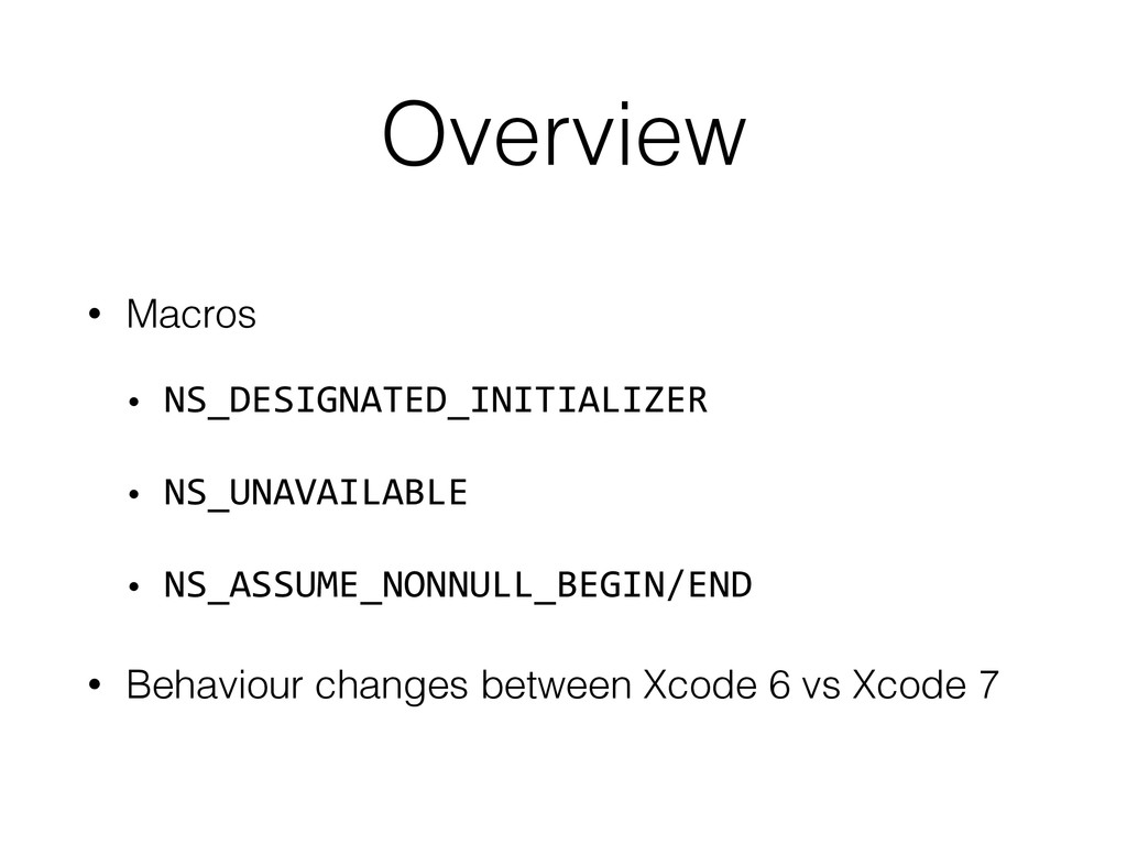 NS_UNAVAILABLE to hide inherited members not relevant to your subclass • Guard against nil inputs and communicate intent with NS_ASSUME_NONNULL_BEGIN/END