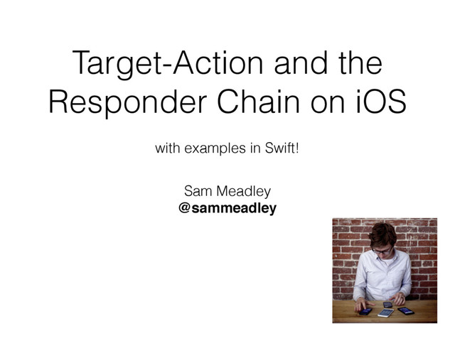 the event to the Responder Chain. UIControl target: nil, action: doSomething UIView UIViewController UIWindow AppDelegate • Starting at the First Responder the chain is traversed until the specified action message is encountered. UIApplication doSomething(_:) UIApplication sendAction(_:to:from:forEvent:)