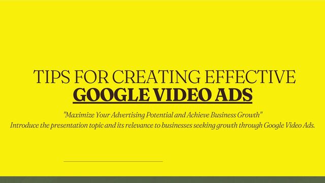 "Tips for Creating Effective Google Video Ads" PPT provides valuable insights and strategies for crafting compelling video ads that captivate viewers, drive engagement, and deliver impactful results on Google's advertising platform. Learn key techniques for storytelling, visual appeal, messaging, and optimizing calls to action to maximize the effectiveness of your video ad campaigns.