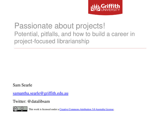 career in project-focused librarianship Sam Searle [email protected] Twitter: @datalibsam This work is licensed under a Creative Commons Attribution 3.0 Australia License.