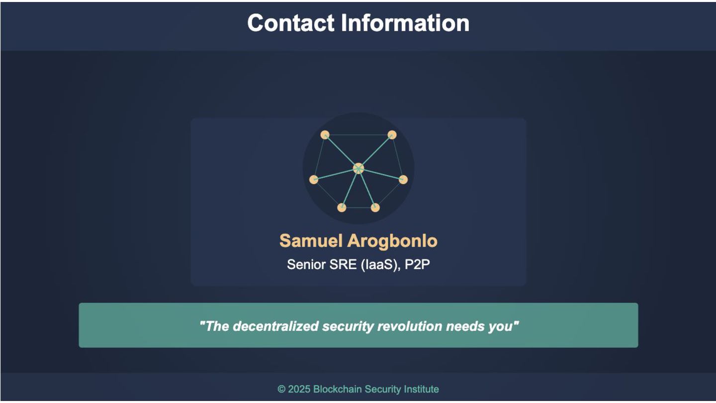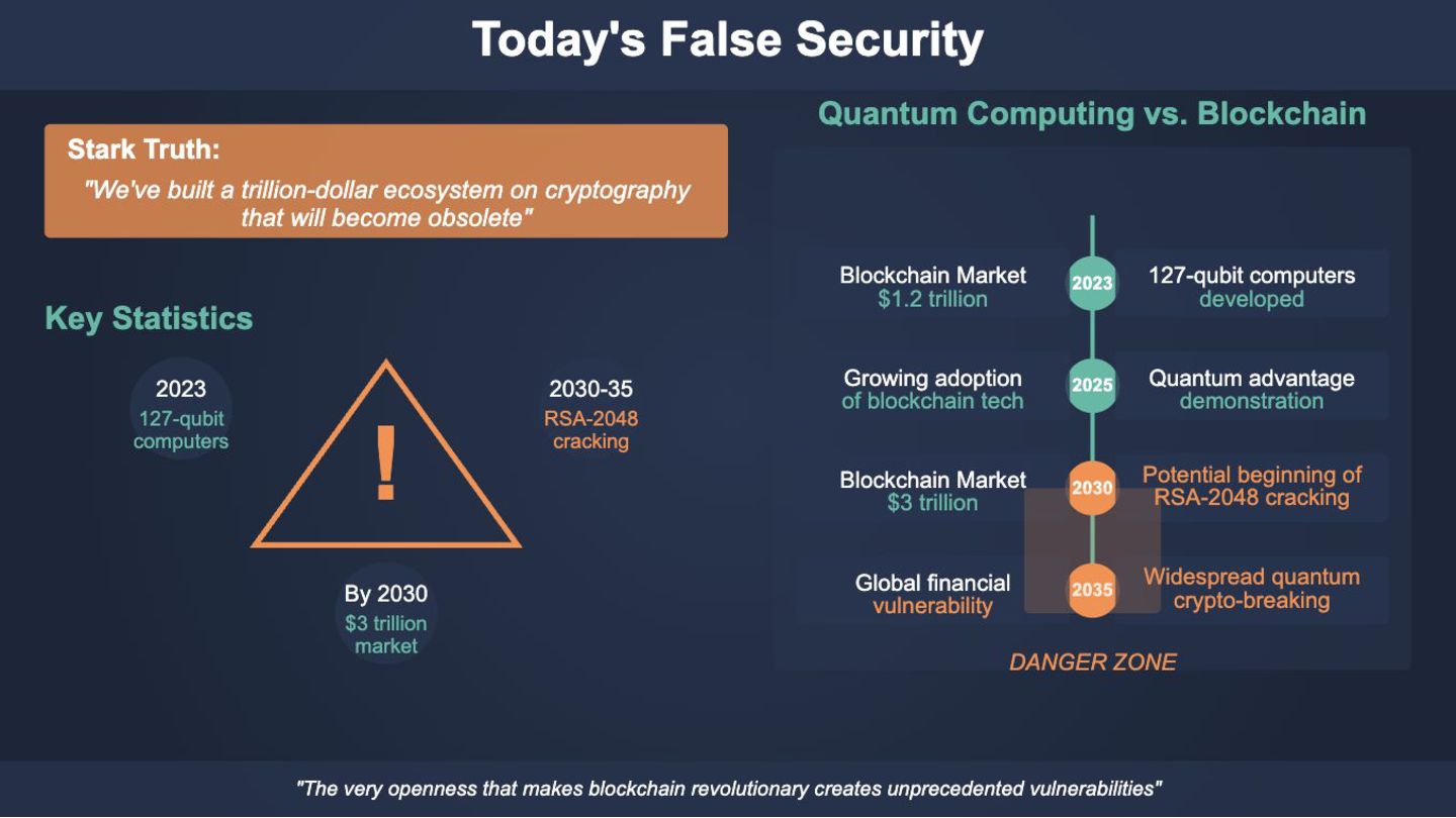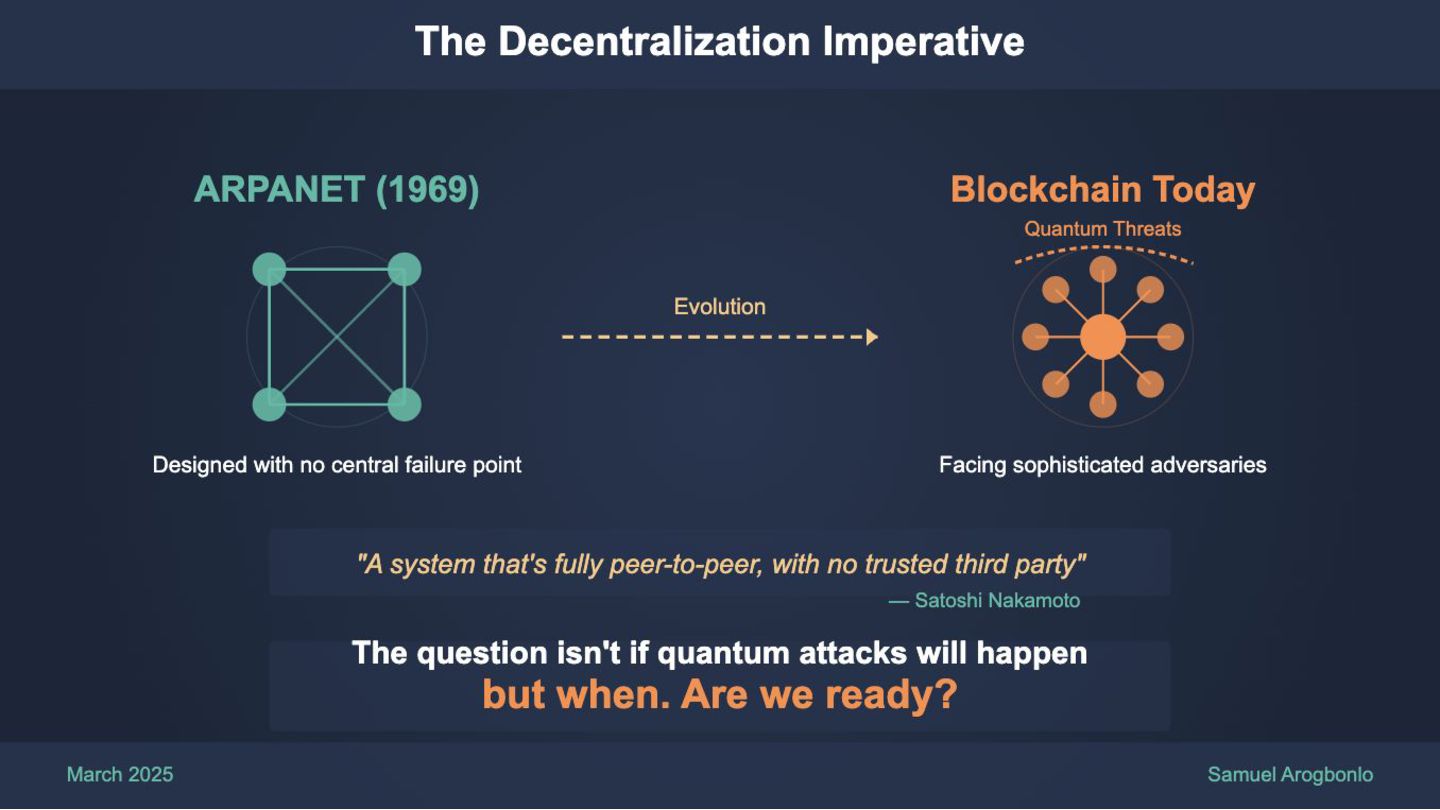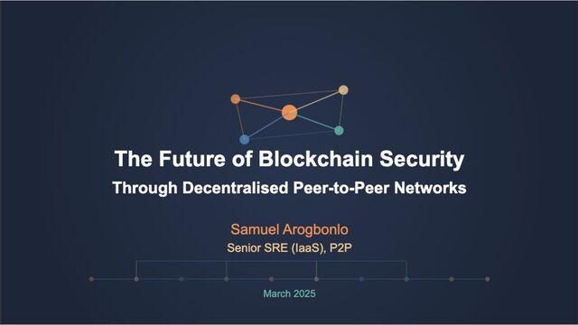 This slide deck presents "The Future of Blockchain Security Through Decentralised Peer-to-Peer Networks" by Samuel Arogbonlo (March 2025). It addresses the looming "quantum nightmare" threatening blockchain's cryptographic foundations, with projections showing vulnerability of current systems by 2030-2035. The presentation analyzes major security failures like the $615M Ronin Bridge hack and $100M Mango Markets exploit to demonstrate how insufficient decentralization creates critical vulnerabilities.
