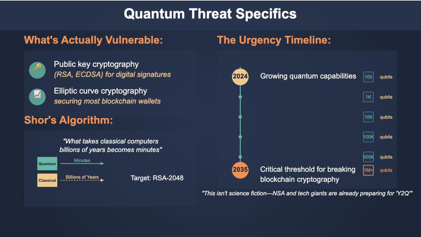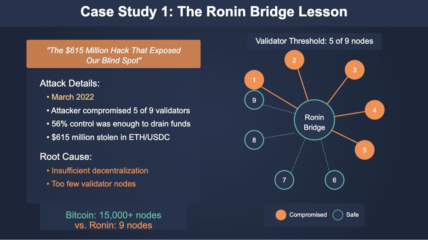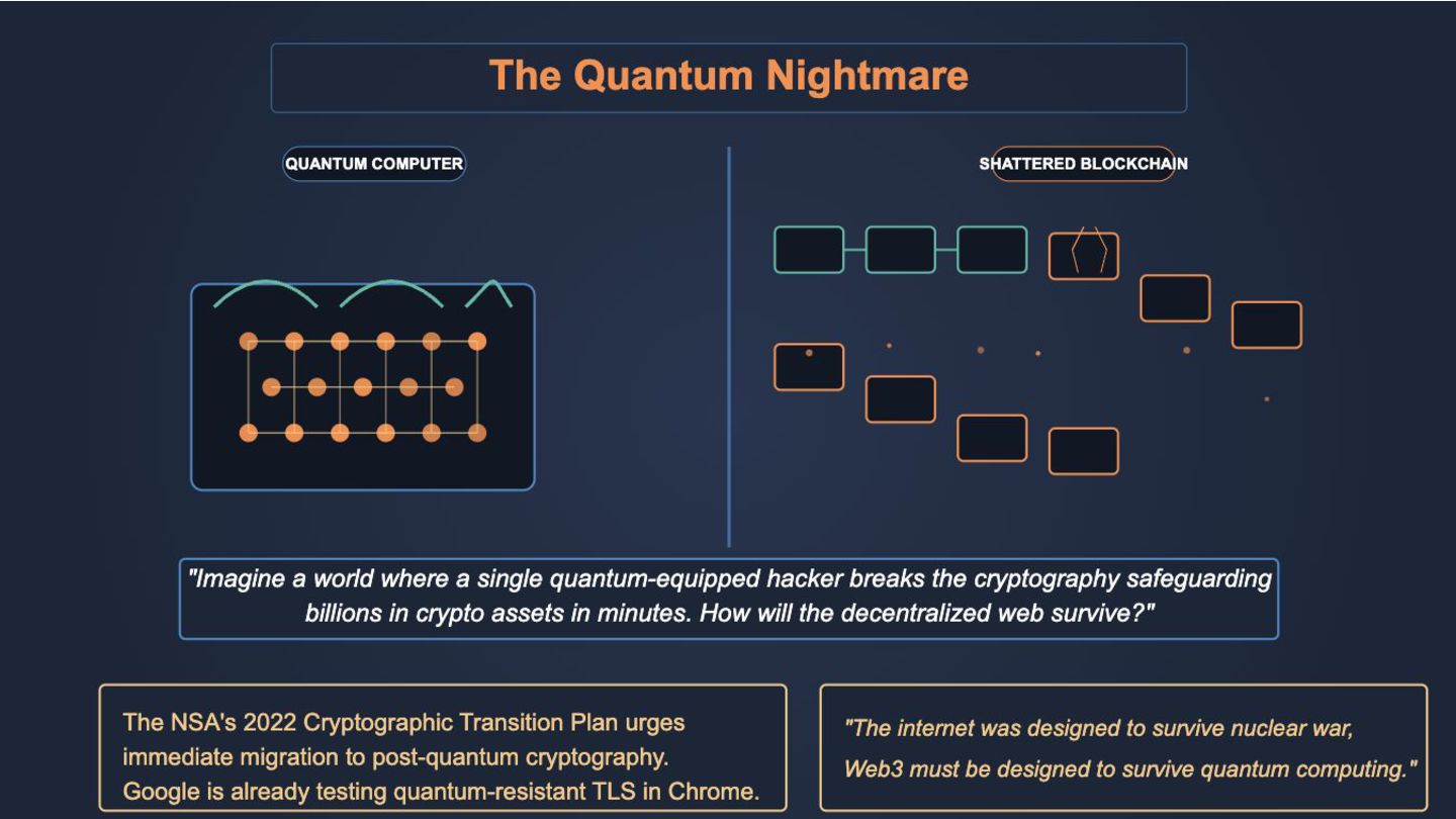 This slide deck presents "The Future of Blockchain Security Through Decentralised Peer-to-Peer Networks" by Samuel Arogbonlo (March 2025). It addresses the looming "quantum nightmare" threatening blockchain's cryptographic foundations, with projections showing vulnerability of current systems by 2030-2035. The presentation analyzes major security failures like the $615M Ronin Bridge hack and $100M Mango Markets exploit to demonstrate how insufficient decentralization creates critical vulnerabilities.