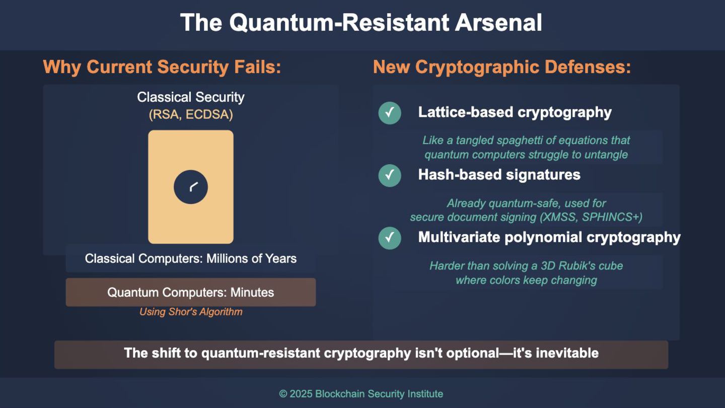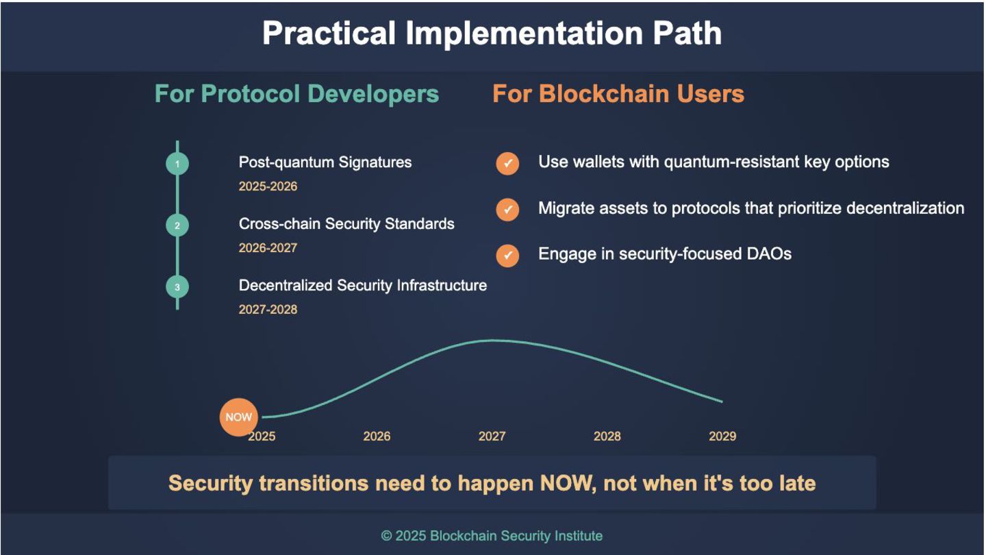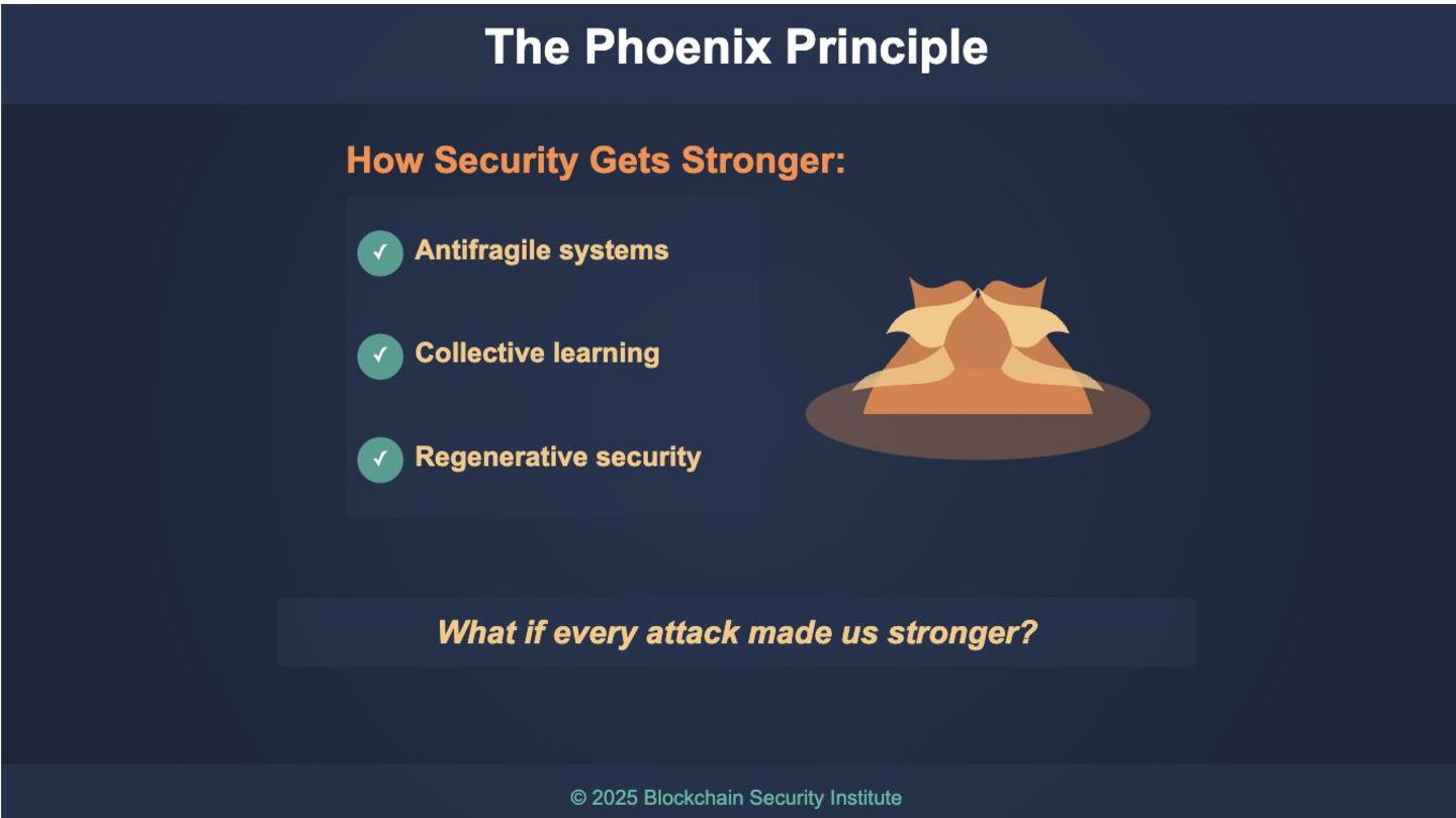 The deck proposes solutions through quantum-resistant cryptography (lattice-based, hash-based signatures), zero-knowledge proofs, and decentralized security architectures modeled after biological immune systems. It outlines practical implementation paths for both developers and users, emphasizing that security transitions must happen immediately rather than reactively. The presentation frames blockchain security as an economic game where attack costs must outweigh potential rewards, and concludes with the "Phoenix Principle" - creating antifragile systems that grow stronger from attacks.
