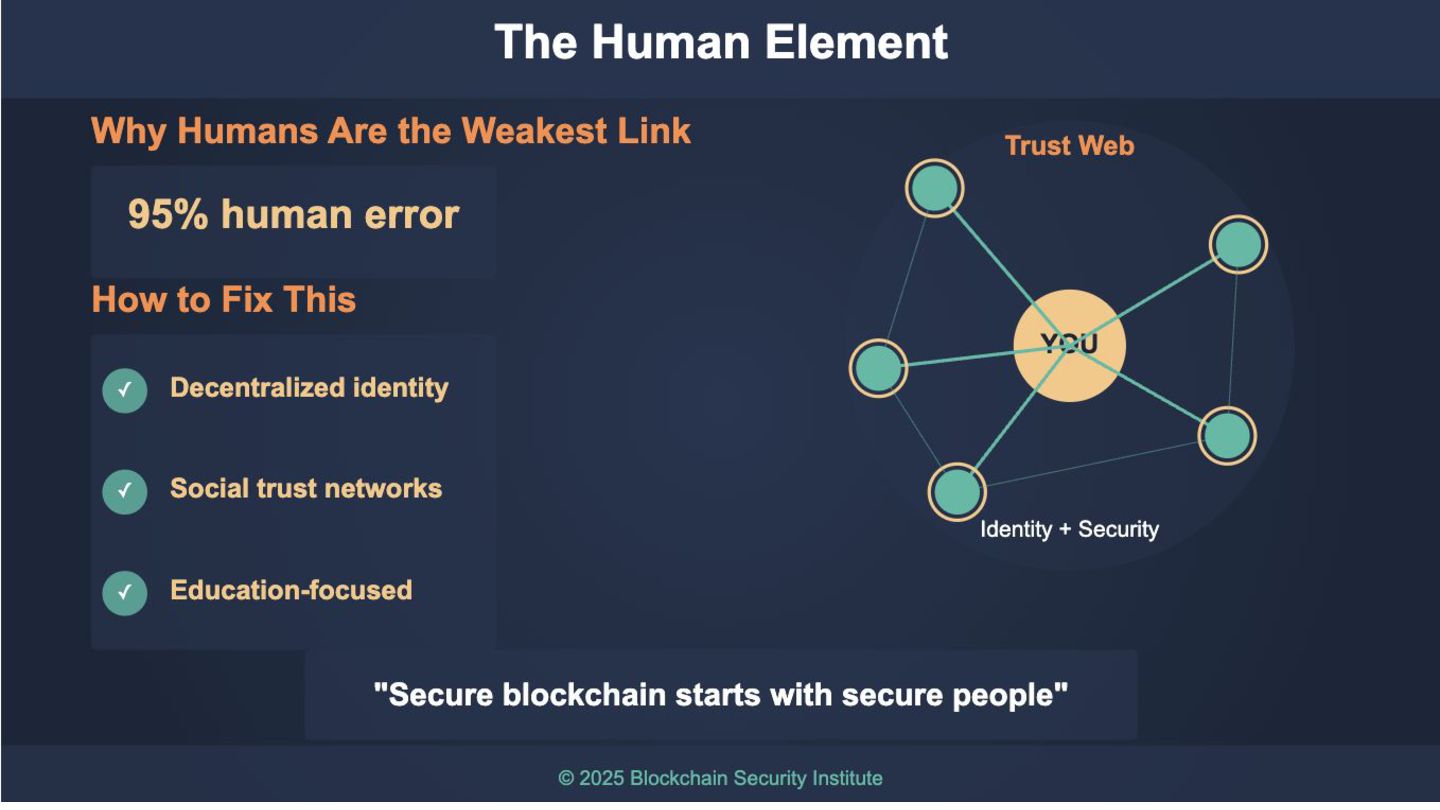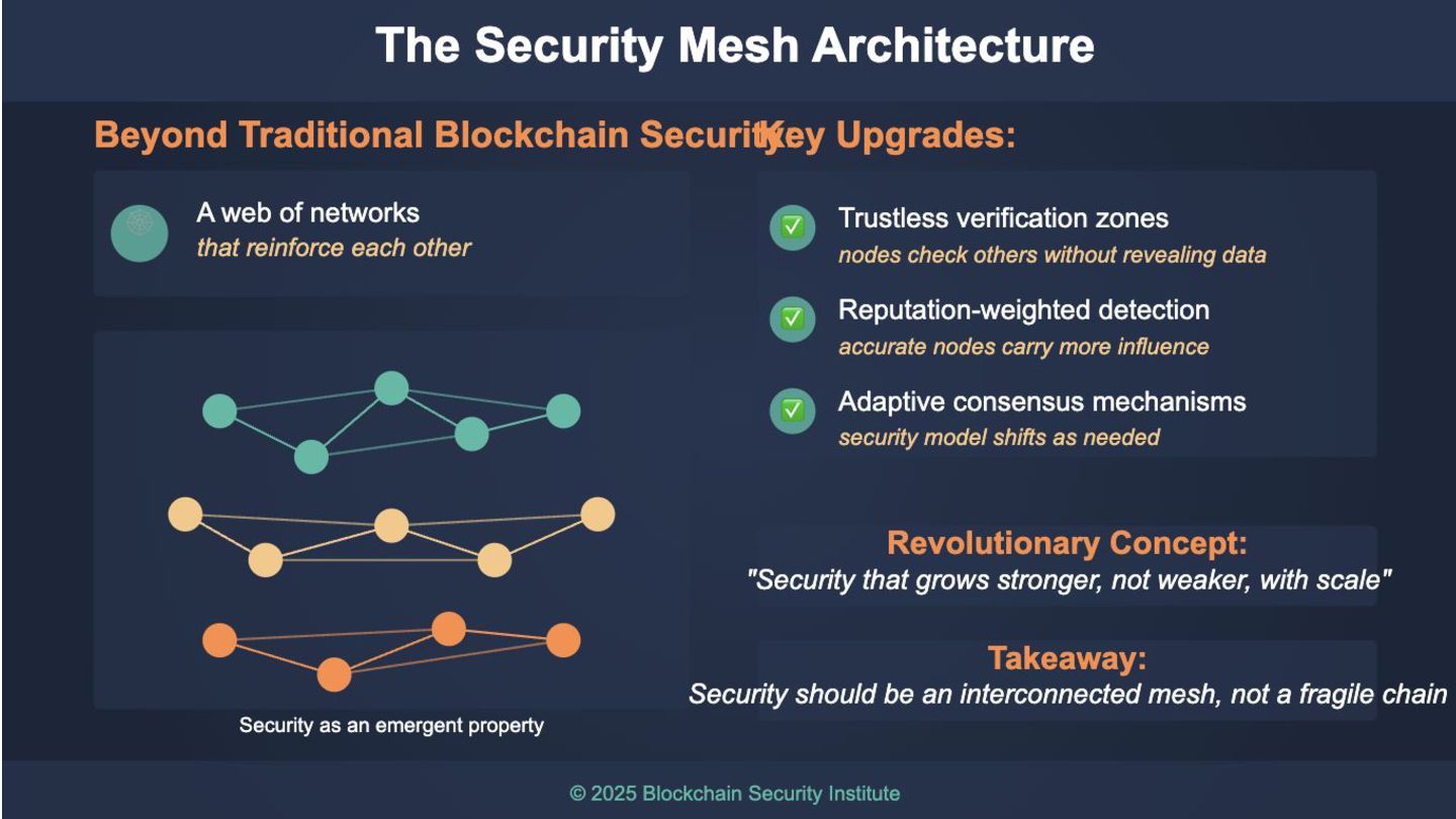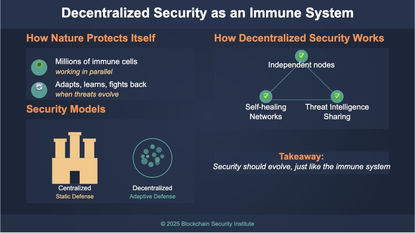 The deck proposes solutions through quantum-resistant cryptography (lattice-based, hash-based signatures), zero-knowledge proofs, and decentralized security architectures modeled after biological immune systems. It outlines practical implementation paths for both developers and users, emphasizing that security transitions must happen immediately rather than reactively. The presentation frames blockchain security as an economic game where attack costs must outweigh potential rewards, and concludes with the "Phoenix Principle" - creating antifragile systems that grow stronger from attacks.