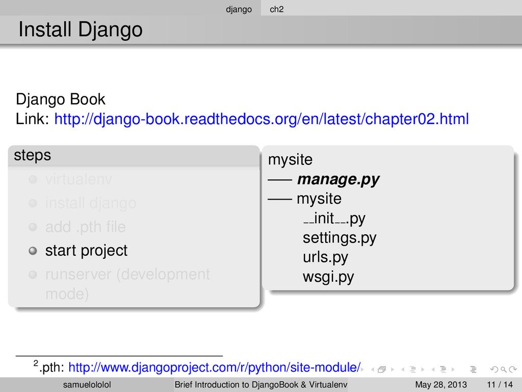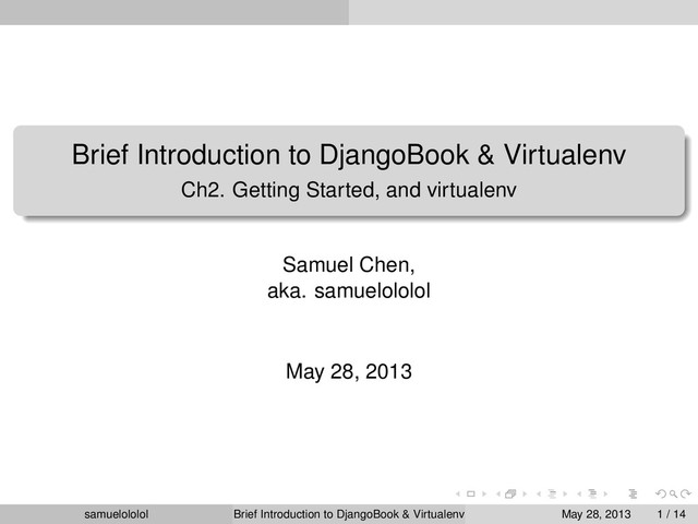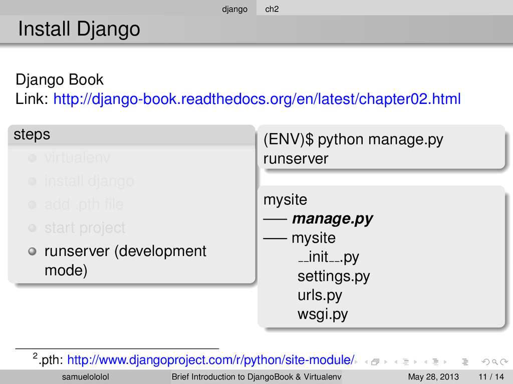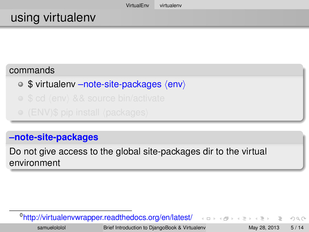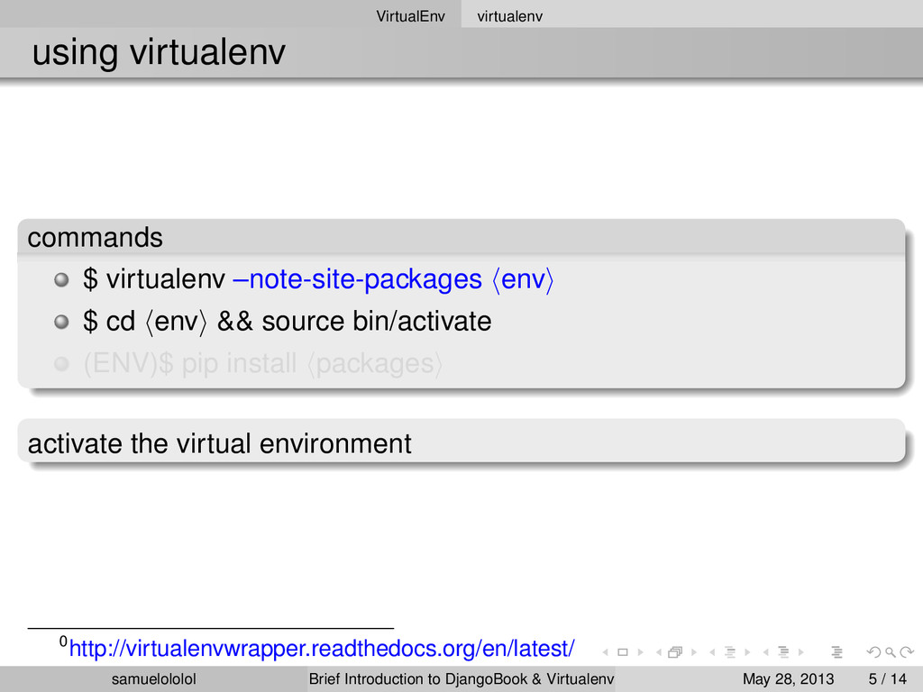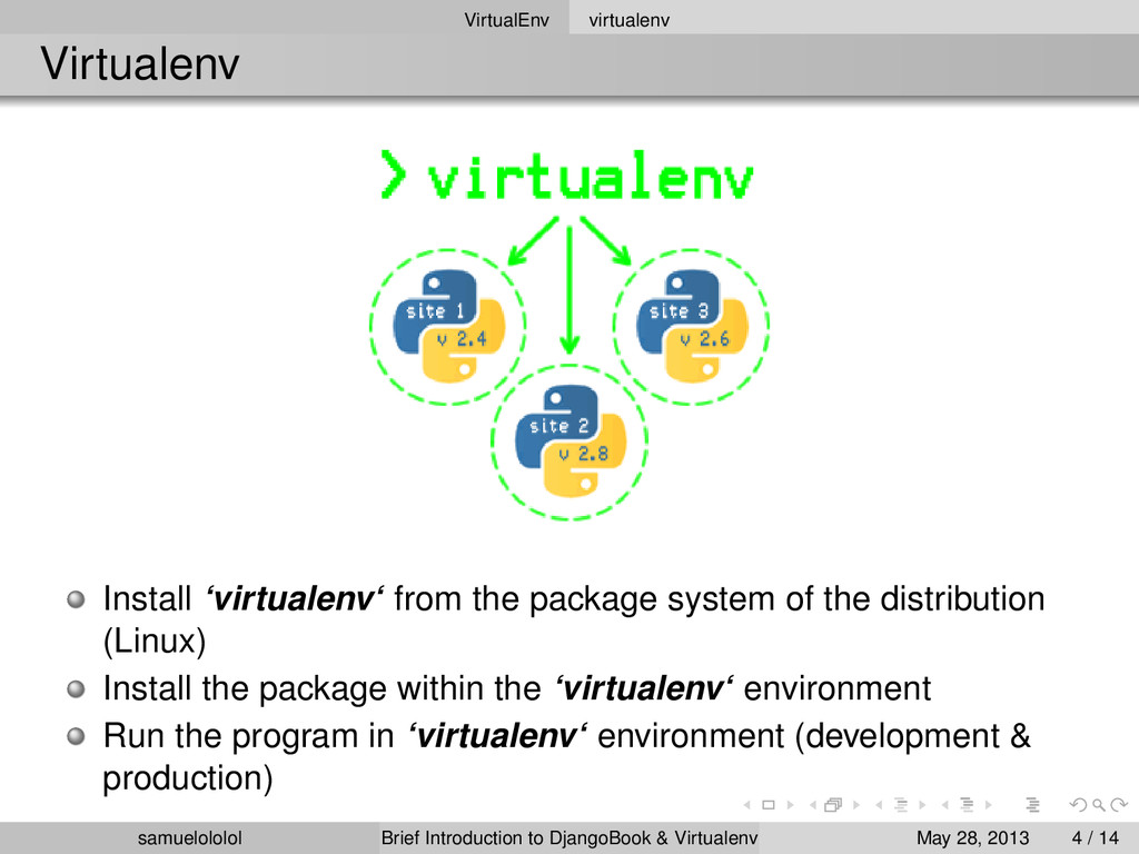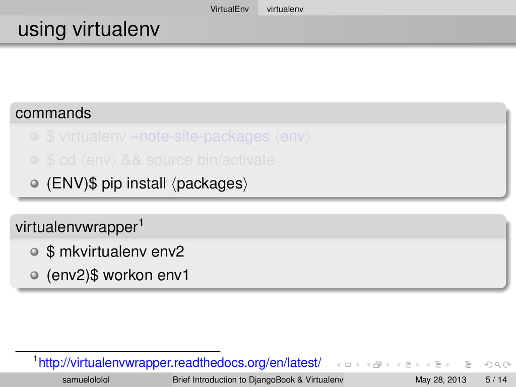 the distribution (Linux) Install the package within the ‘virtualenv‘ environment Run the program in ‘virtualenv‘ environment (development & production) samuelololol Brief Introduction to DjangoBook & Virtualenv May 28, 2013 4 / 14
