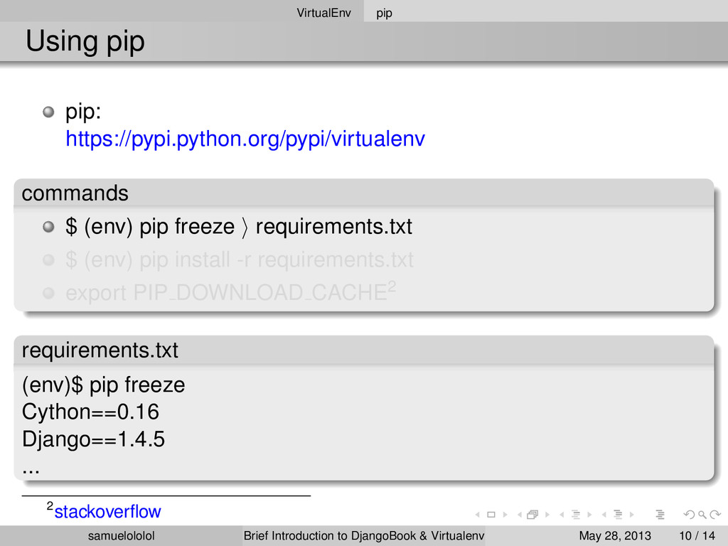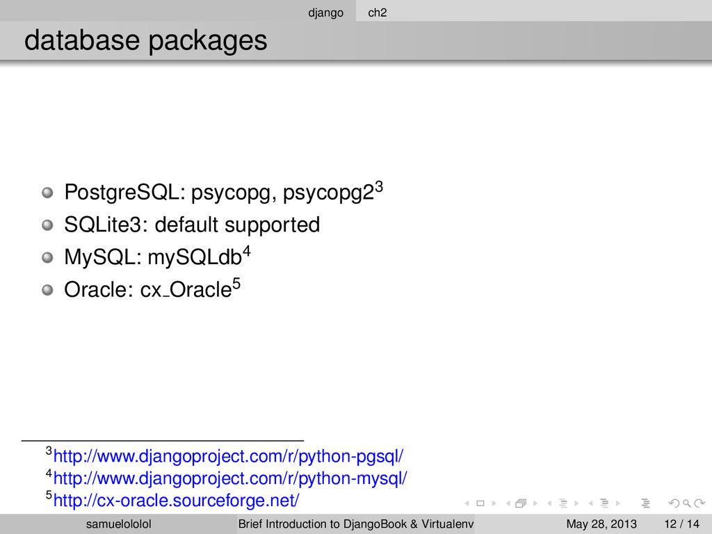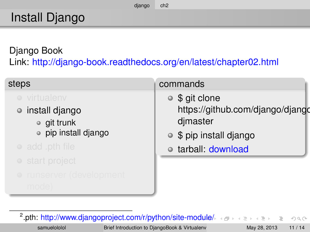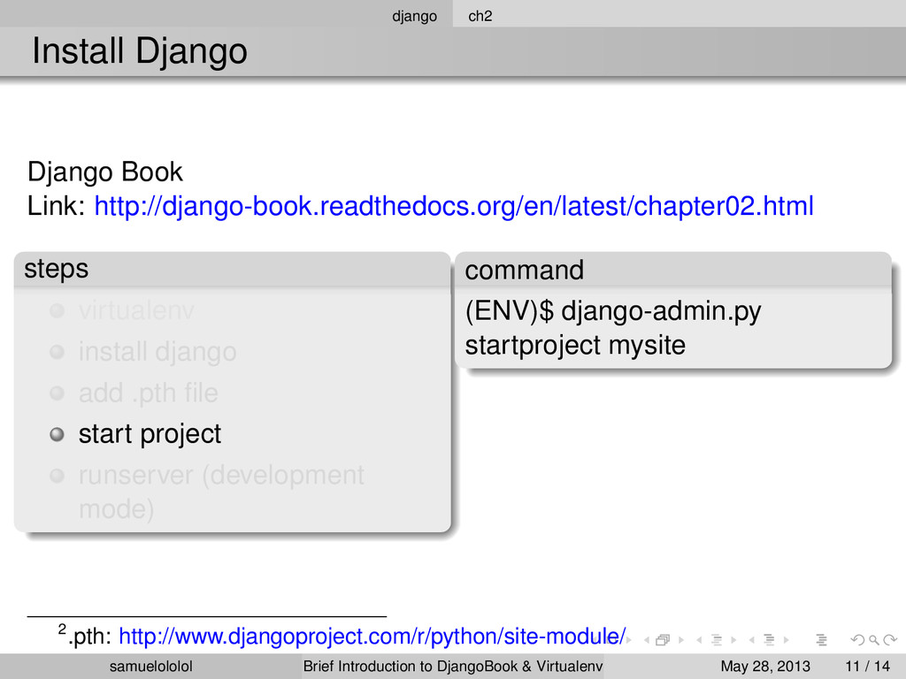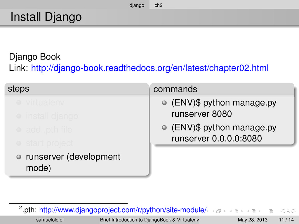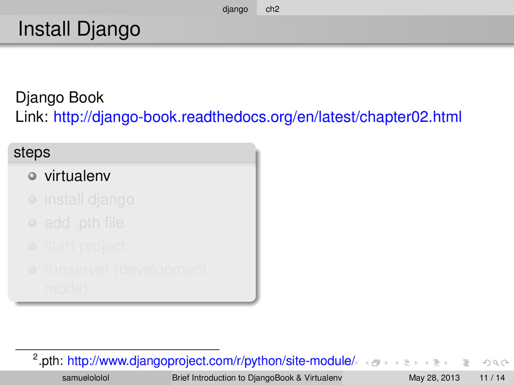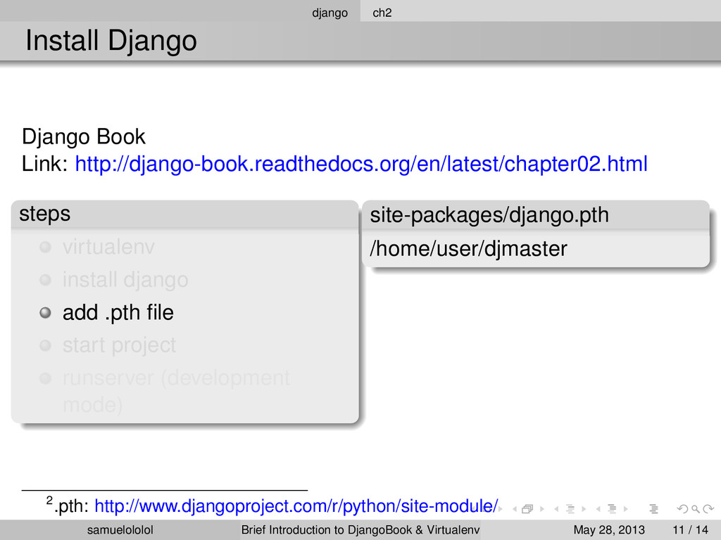 the distribution (Linux) Install the package within the ‘virtualenv‘ environment Run the program in ‘virtualenv‘ environment (development & production) samuelololol Brief Introduction to DjangoBook & Virtualenv May 28, 2013 4 / 14