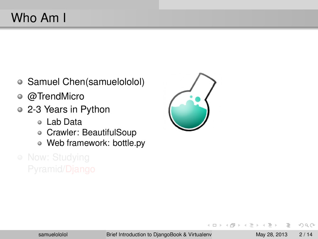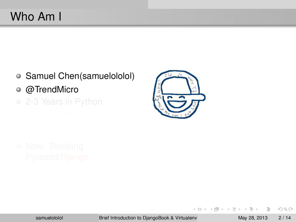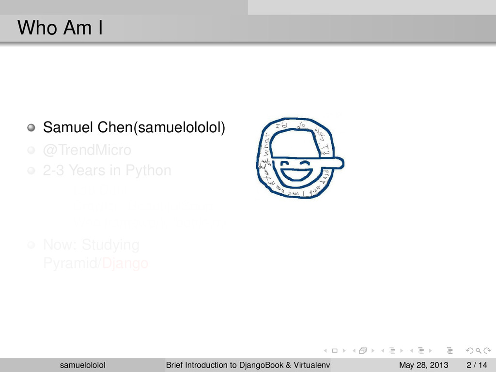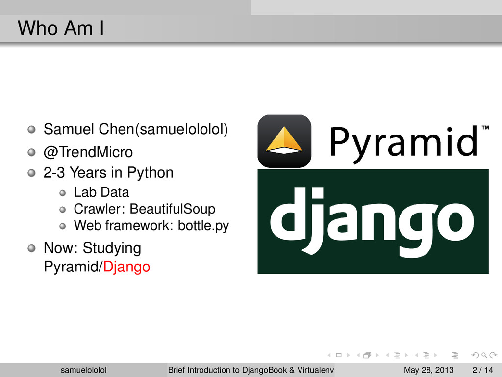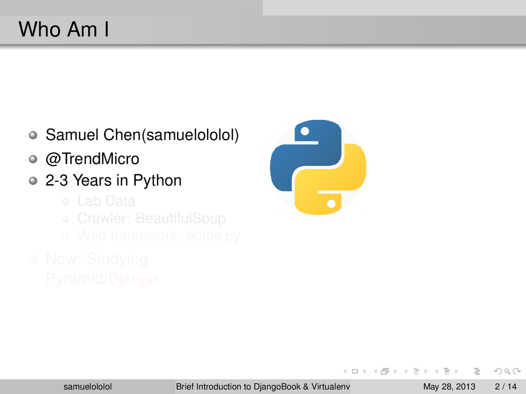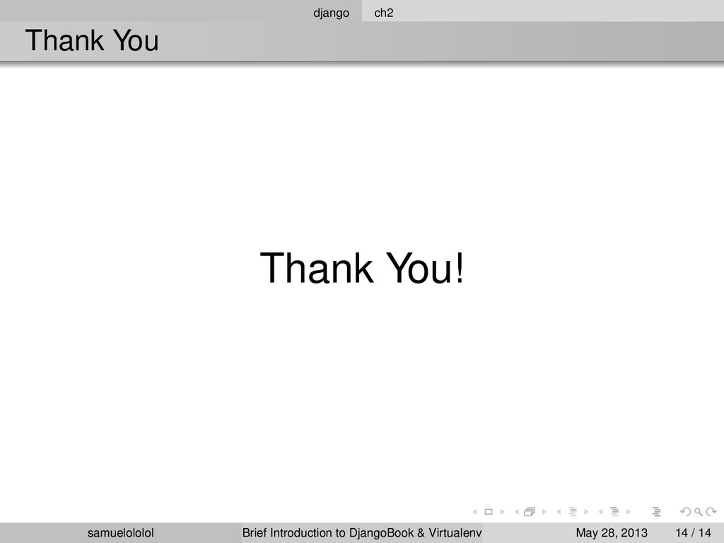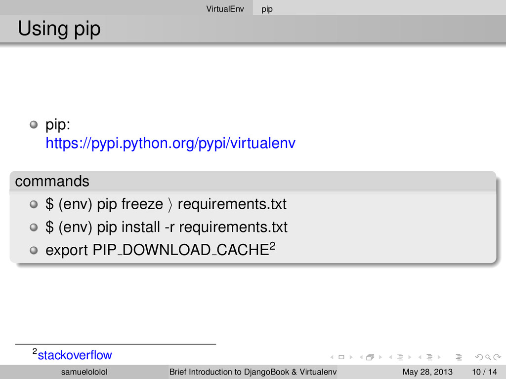 the distribution (Linux) Install the package within the ‘virtualenv‘ environment Run the program in ‘virtualenv‘ environment (development & production) samuelololol Brief Introduction to DjangoBook & Virtualenv May 28, 2013 4 / 14