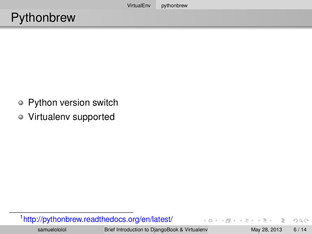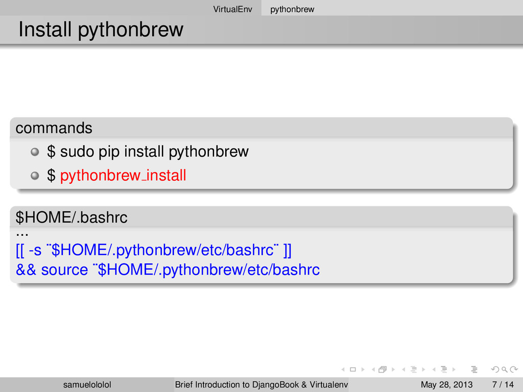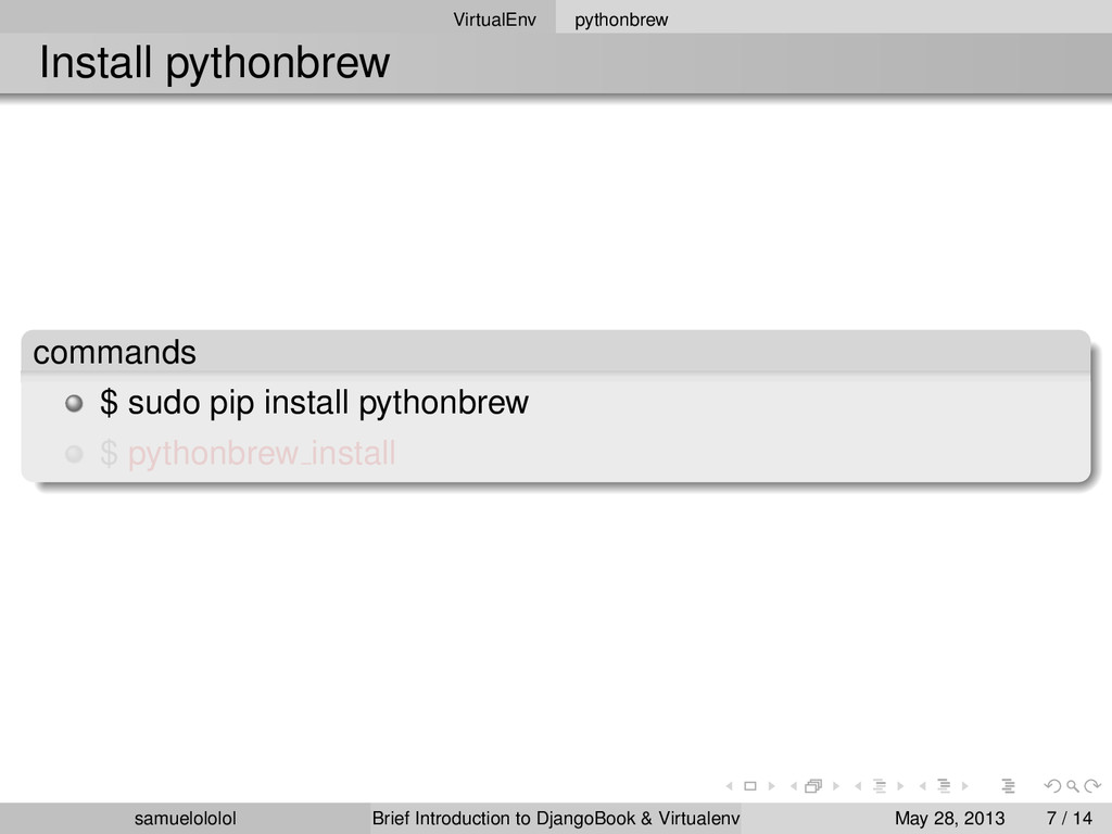 install 2.7.3 $ pythonbrew switch 2.7.3 $ pythonbrew list $ pythonbrew use 2.7.3 version Switched to Python-2.7.3 samuelololol Brief Introduction to DjangoBook & Virtualenv May 28, 2013 8 / 14