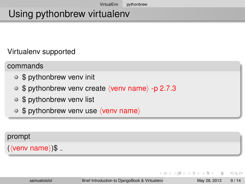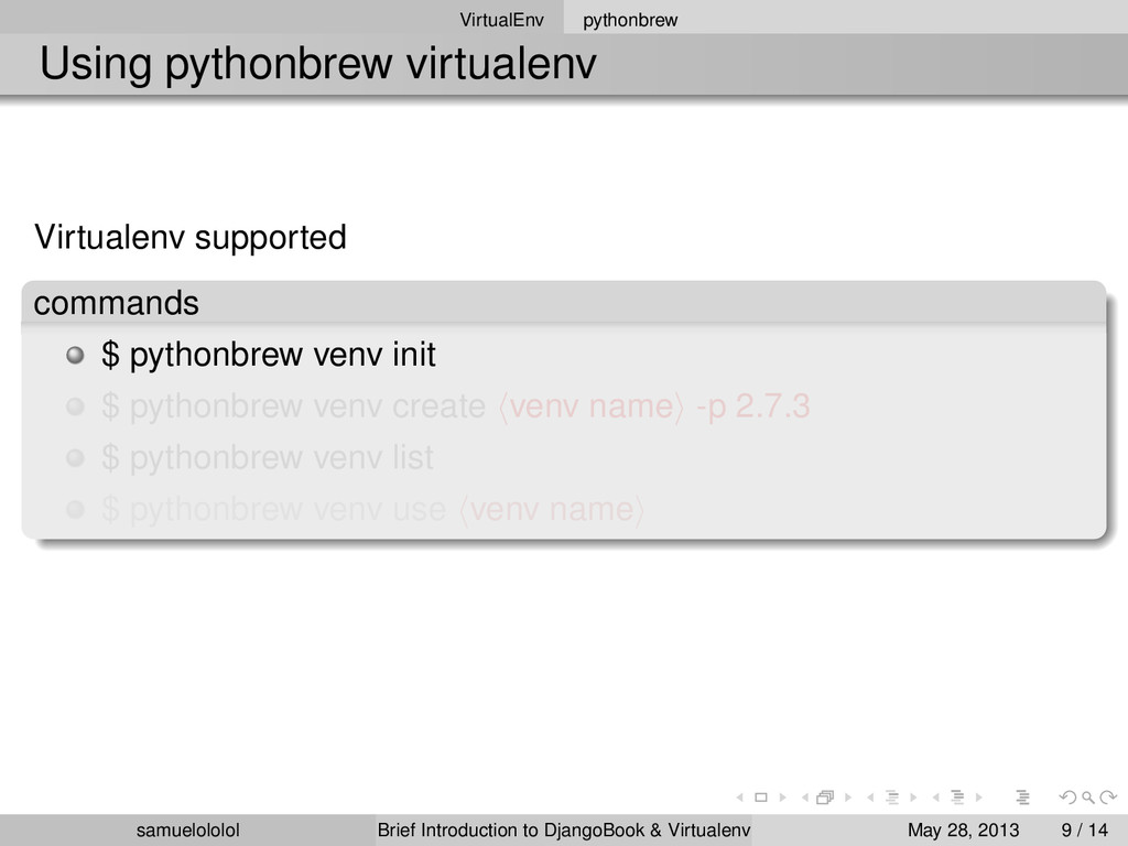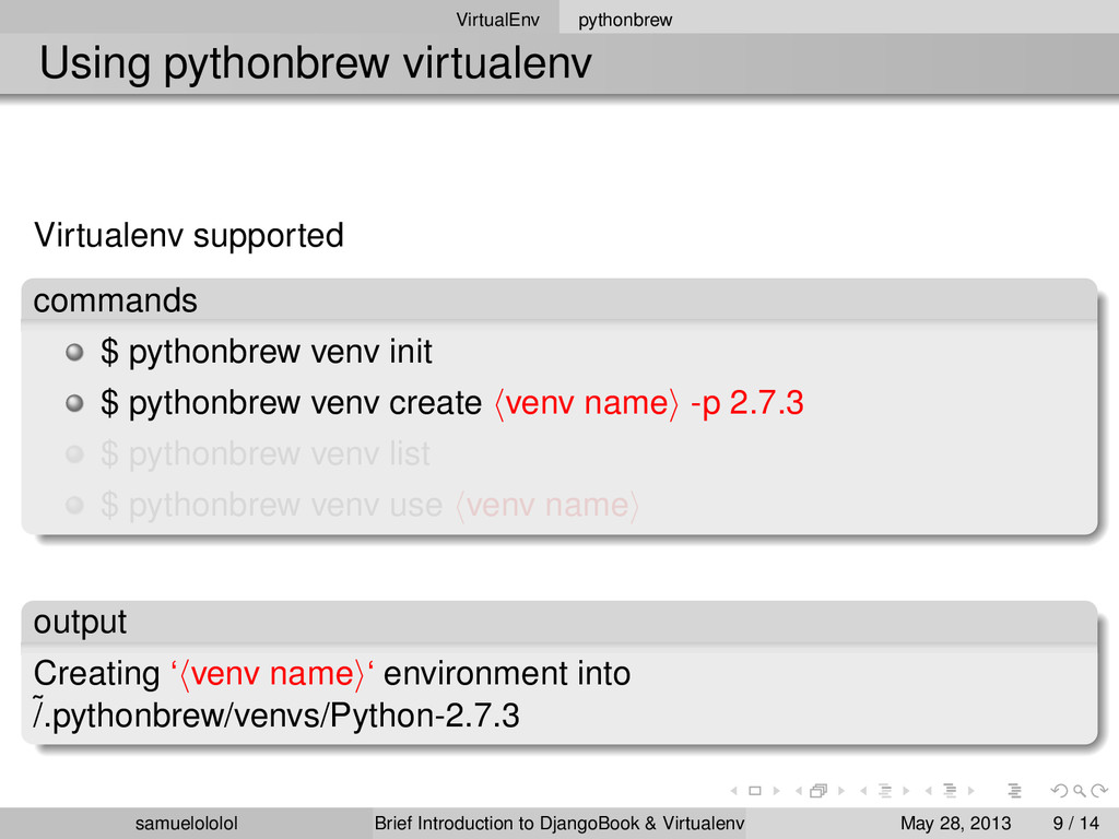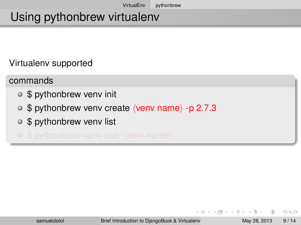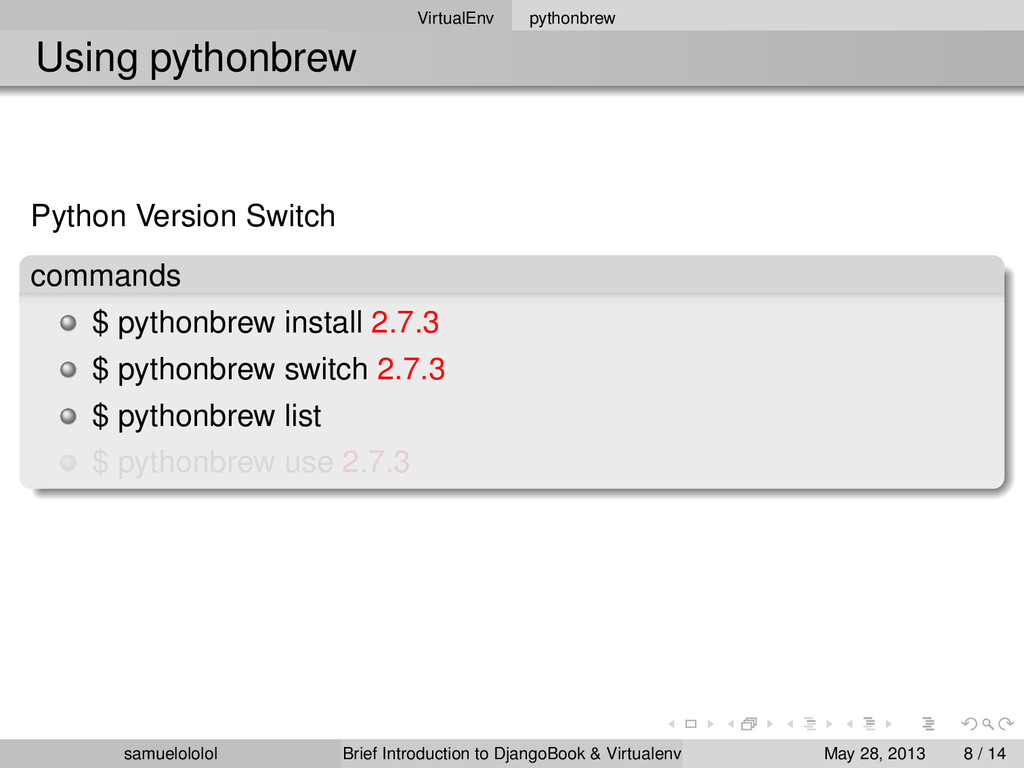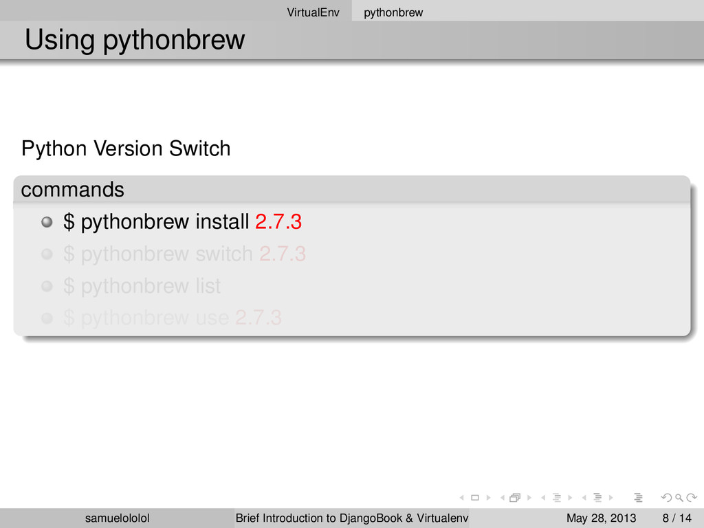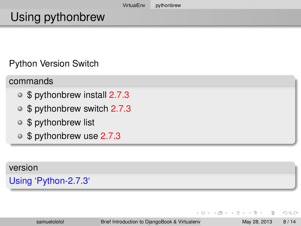 install 2.7.3 $ pythonbrew switch 2.7.3 $ pythonbrew list $ pythonbrew use 2.7.3 version Using ‘Python-2.7.3‘ samuelololol Brief Introduction to DjangoBook & Virtualenv May 28, 2013 8 / 14
