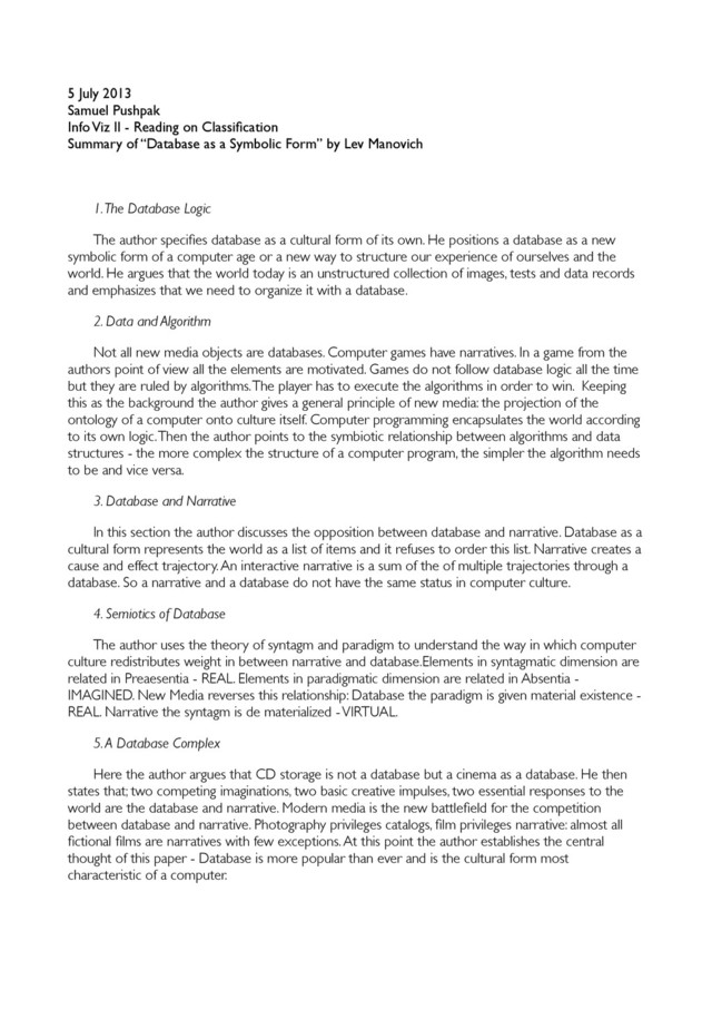 on Classification Summary of “Database as a Symbolic Form” by Lev Manovich 1. The Database Logic The author specifies database as a cultural form of its own. He positions a database as a new symbolic form of a computer age or a new way to structure our experience of ourselves and the world. He argues that the world today is an unstructured collection of images, tests and data records and emphasizes that we need to organize it with a database. 2. Data and Algorithm Not all new media objects are databases. Computer games have narratives. In a game from the authors point of view all the elements are motivated. Games do not follow database logic all the time but they are ruled by algorithms. The player has to execute the algorithms in order to win. Keeping this as the background the author gives a general principle of new media: the projection of the ontology of a computer onto culture itself. Computer programming encapsulates the world according to its own logic. Then the author points to the symbiotic relationship between algorithms and data structures - the more complex the structure of a computer program, the simpler the algorithm needs to be and vice versa. 3. Database and Narrative In this section the author discusses the opposition between database and narrative. Database as a cultural form represents the world as a list of items and it refuses to order this list. Narrative creates a cause and effect trajectory. An interactive narrative is a sum of the of multiple trajectories through a database. So a narrative and a database do not have the same status in computer culture. 4. Semiotics of Database The author uses the theory of syntagm and paradigm to understand the way in which computer culture redistributes weight in between narrative and database.Elements in syntagmatic dimension are related in Preaesentia - REAL. Elements in paradigmatic dimension are related in Absentia - IMAGINED. New Media reverses this relationship: Database the paradigm is given material existence - REAL. Narrative the syntagm is de materialized - VIRTUAL. 5. A Database Complex Here the author argues that CD storage is not a database but a cinema as a database. He then states that; two competing imaginations, two basic creative impulses, two essential responses to the world are the database and narrative. Modern media is the new battlefield for the competition between database and narrative. Photography privileges catalogs, film privileges narrative: almost all fictional films are narratives with few exceptions. At this point the author establishes the central thought of this paper - Database is more popular than ever and is the cultural form most characteristic of a computer.