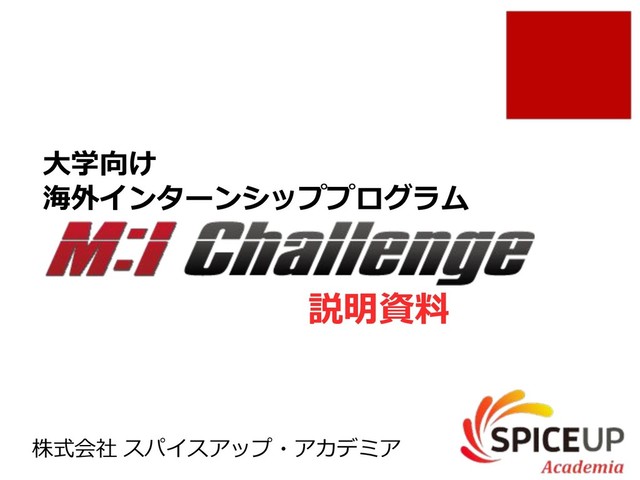 (株)スパイスアップ・アカデミアが、全国20の大学、専門学校に提供している、海外インターンシッププログラム、M:Iチャレンジの紹介資料です。