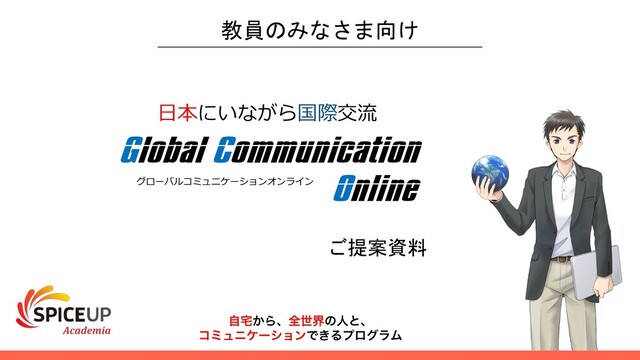 ⽇本にいながら国際交流 教員のみなさま向け ͔ࣗΒɺશੈքͷਓͱɺ ίϛϡχέʔγϣϯͰ͖ΔϓϩάϥϜ ご提案資料 Global Communication Online グローバルコミュニケーションオンライン