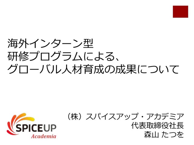 海外インターン型 研修プログラムによる、 グローバル⼈材育成の成果について (株)スパイスアップ・アカデミア 代表取締役社⻑ 森⼭ たつを