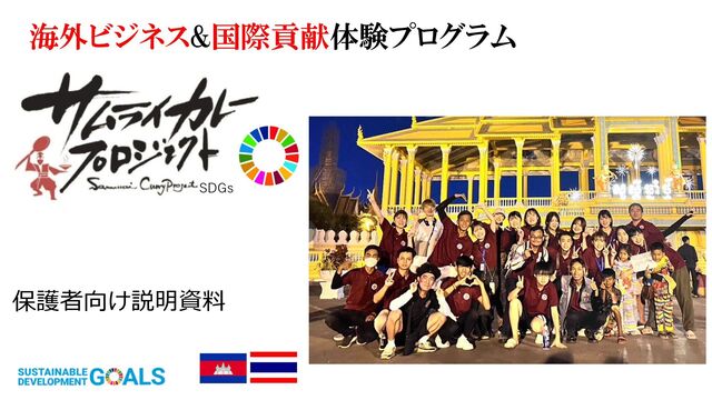2週間で国際貢献と海外インターンが体験できるプログラム、サムライカレープロジェクト 保護者の皆さん向けの説明事項をまとめた資料です。