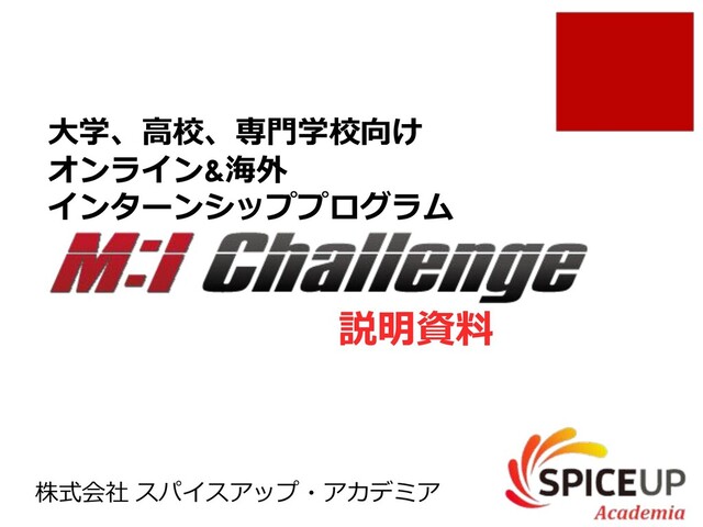 (株)スパイスアップ・アカデミアが提供する、大学、高校、専門学校向けのオンラインおよび海外インターンシッププログラムの詳細を説明する資料です。