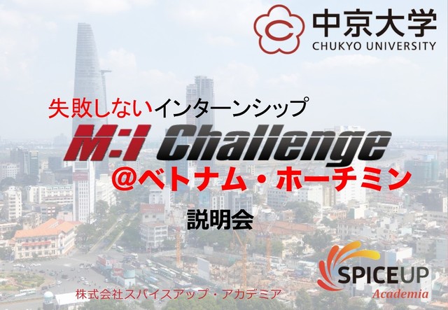 中京大学の夏季インターンシッププログラム M:I Challenge in ベトナムの説明会資料です。 卒業後、海外で活躍したいみなさんに、外国人相手のビジネスの基礎を学んでもらえるプログラムです。
