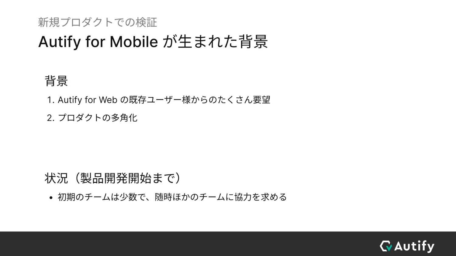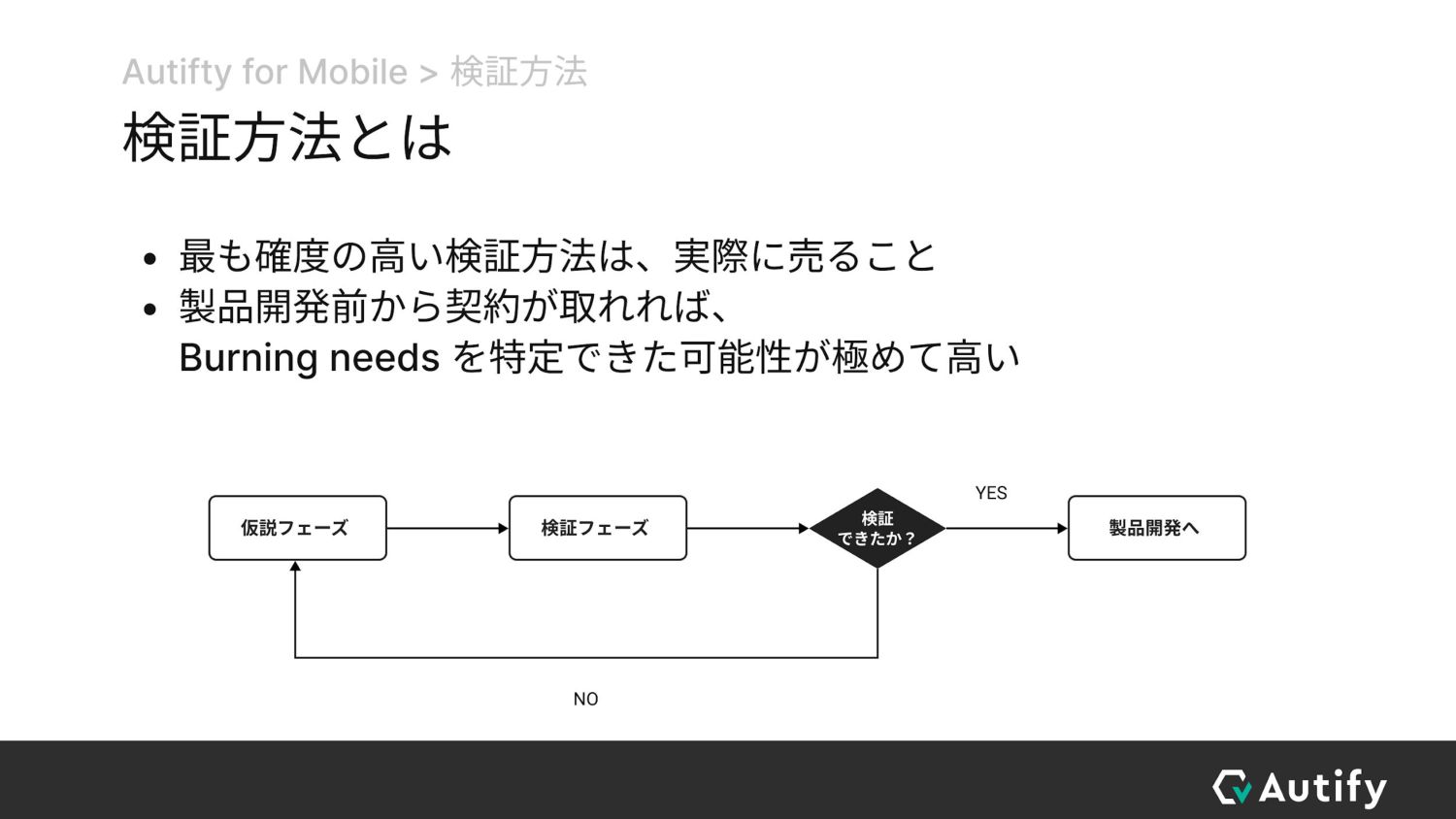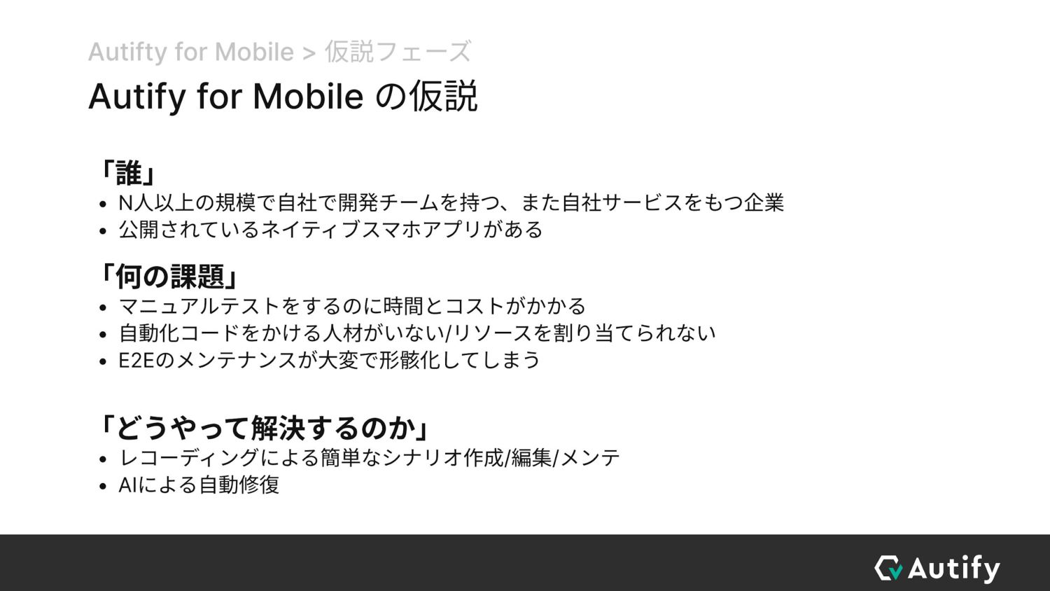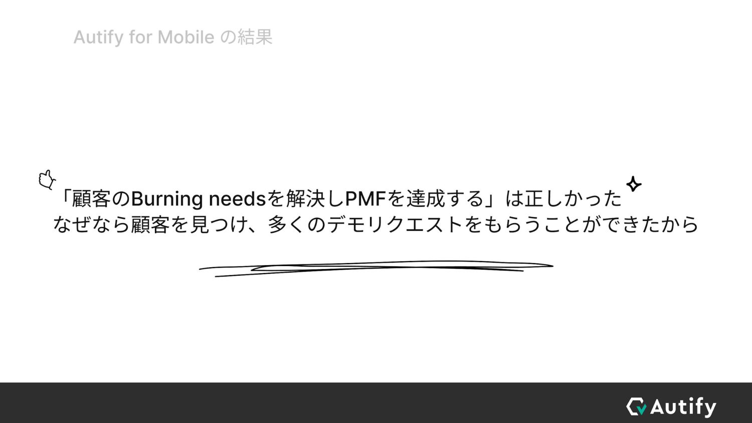 pmconf2020にてセッション満足度1位を獲得した、Autify CEO近澤による「顧客のBurning needsを解決し、PMFを達成する」セッション。果たしてこのメソッドは本当に再現性があるものなのか。Autifyにとって2つ目のプロダクトとなる新プロダクト「Autify for Mobile」の立ち上げとPMを担った共同創業者の山下が、実践してみた結果とその軌跡を振り返ります。