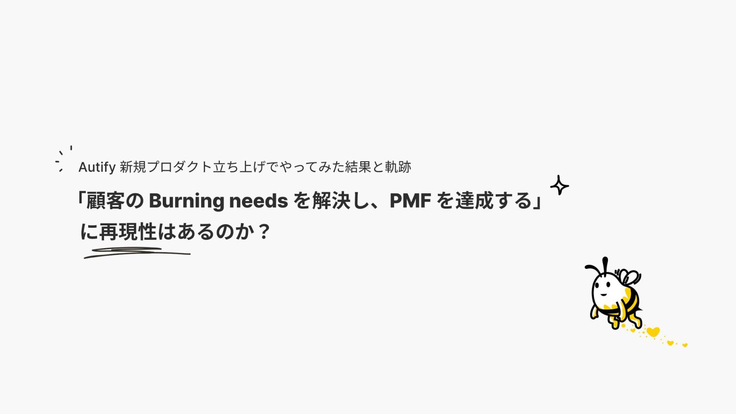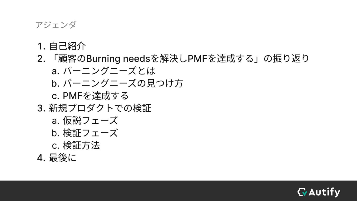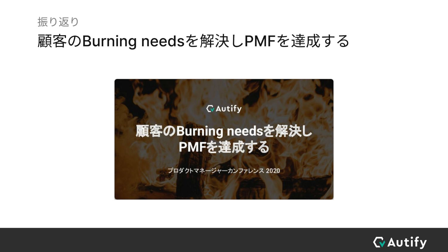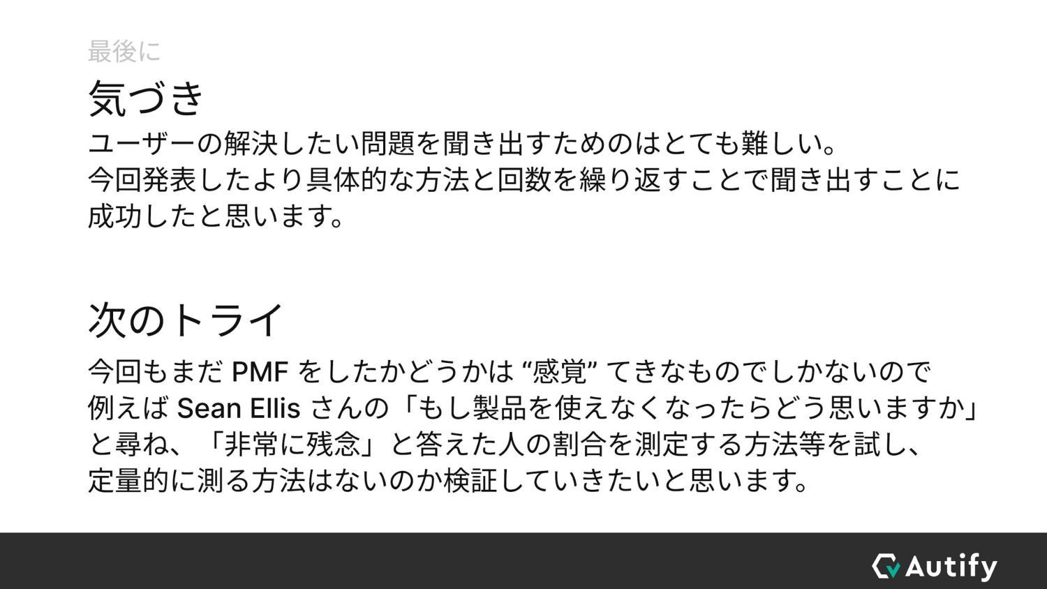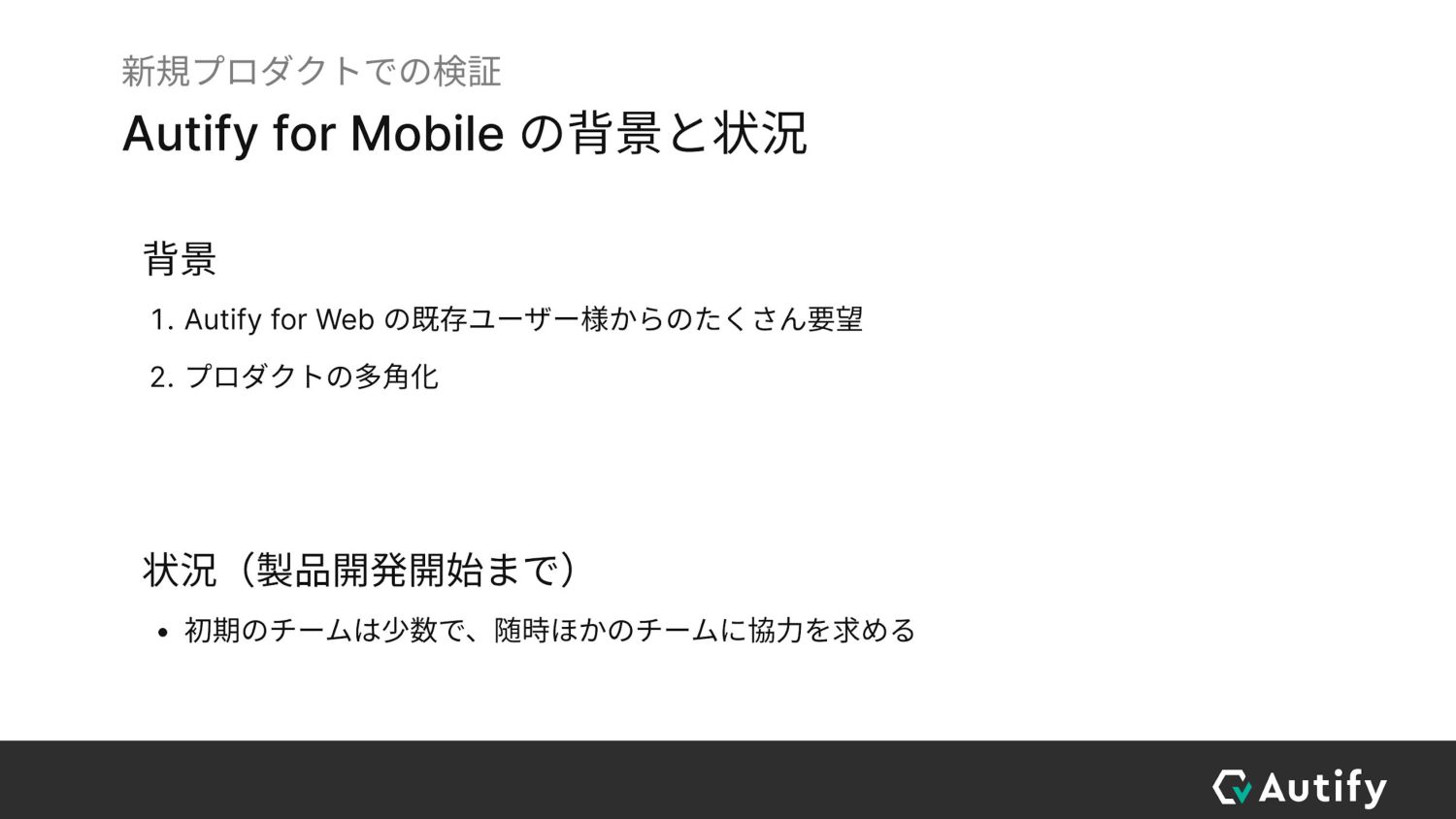 pmconf2020にてセッション満足度1位を獲得した、Autify CEO近澤による「顧客のBurning needsを解決し、PMFを達成する」セッション。果たしてこのメソッドは本当に再現性があるものなのか。Autifyにとって2つ目のプロダクトとなる新プロダクト「Autify for Mobile」の立ち上げとPMを担った共同創業者の山下が、実践してみた結果とその軌跡を振り返ります。
