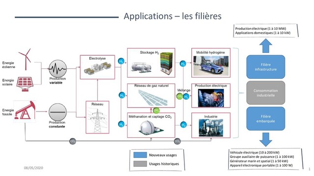 Consommation industrielle Nouveaux usages Usages historiques Production électrique (1 à 10 MW) Applications domestiques (1 à 10 kW) Véhicule électrique (10 à 200 kW) Groupe auxiliaire de puissance (1 à 100 kW) Générateur marin et spatial (1 à 50 kW) Appareil électronique portable (1 à 100 W)