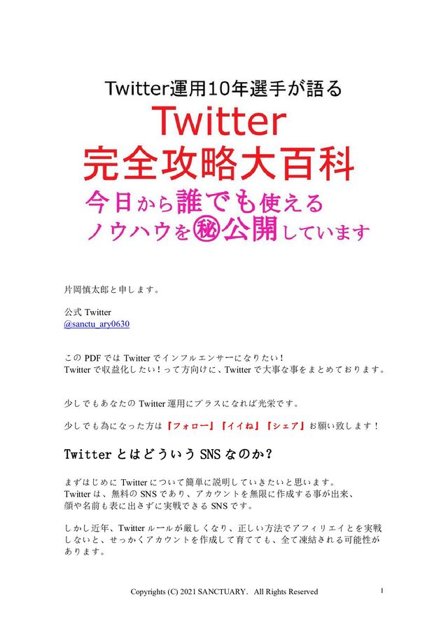 @sanctu_ary0630 この PDF では Twitter でインフルエンサーになりたい! Twitter で収益化したい! って方向けに、 Twitter で大事な事をまとめております。 少しでもあなたの Twitter 運用にプラスになれば光栄です。 少しでも為になった方は『フォロー』『イイね』『シェア』お願い致します! Twitter とはどういう SNS なのか? まずはじめに Twitter について簡単に説明していきたいと思います。 Twitter は、無料の SNS であり、アカウントを無限に作成する事が出来、 顔や名前も表に出さずに実戦できる SNS です。 しかし近年、Twitter ルールが厳しくなり、正しい方法でアフィリエイとを実戦 しないと、せっかくアカウントを作成して育てても、全て凍結される可能性が あります。