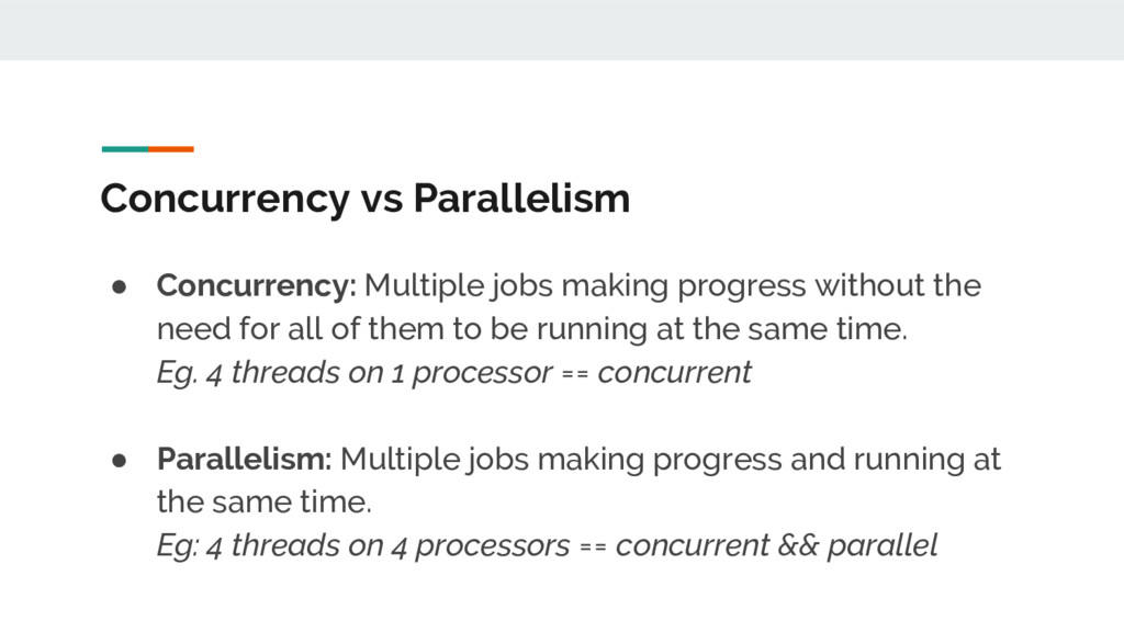 the need for all of them to be running at the same time. Eg. 4 threads on 1 processor == concurrent • Parallelism: Multiple jobs making progress and running at the same time. Eg: 4 threads on 4 processors == concurrent && parallel