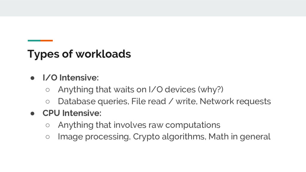 on I/O devices (why?) ◦ Database queries, File read / write, Network requests • CPU Intensive: ◦ Anything that involves raw computations ◦ Image processing, Crypto algorithms, Math in general