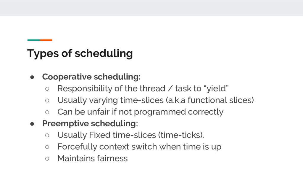 thread / task to “yield” ◦ Usually varying time-slices (a.k.a functional slices) ◦ Can be unfair if not programmed correctly • Preemptive scheduling: ◦ Usually Fixed time-slices (time-ticks). ◦ Forcefully context switch when time is up ◦ Maintains fairness