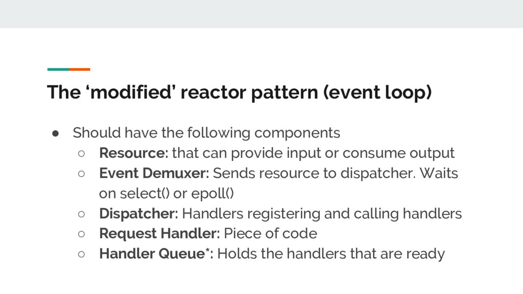 following components ◦ Resource: that can provide input or consume output ◦ Event Demuxer: Sends resource to dispatcher. Waits on select() or epoll() ◦ Dispatcher: Handlers registering and calling handlers ◦ Request Handler: Piece of code ◦ Handler Queue*: Holds the handlers that are ready