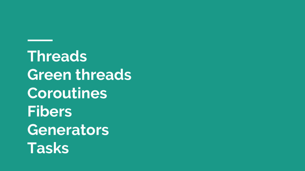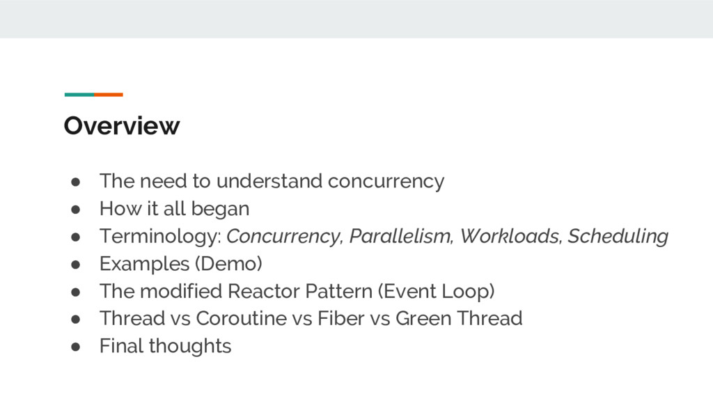 all began • Terminology: Concurrency, Parallelism, Workloads, Scheduling • Examples (Demo) • The modified Reactor Pattern (Event Loop) • Thread vs Coroutine vs Fiber vs Green Thread • Final thoughts