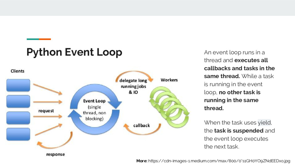 and executes all callbacks and tasks in the same thread. While a task is running in the event loop, no other task is running in the same thread. When the task uses yield, the task is suspended and the event loop executes the next task. More: https://cdn-images-1.medium.com/max/800/0*s1GH0YO9ZNdEEDxo.jpg
