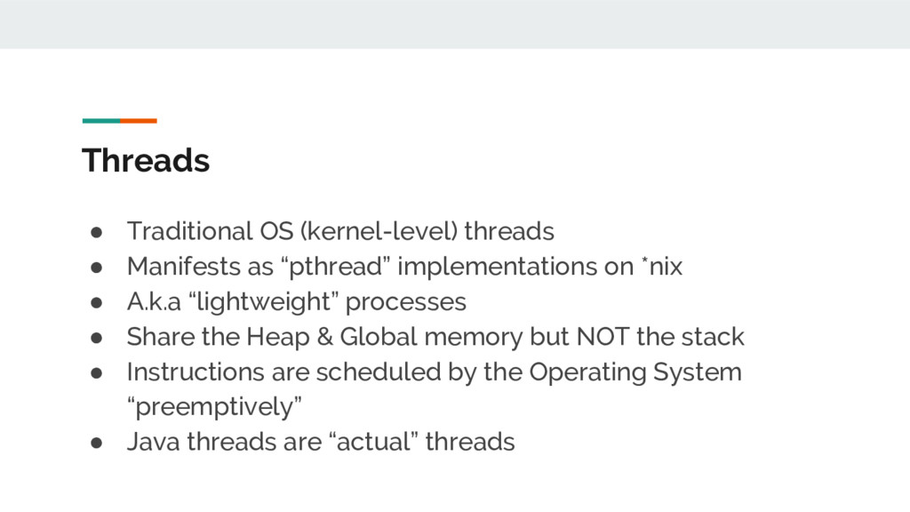 implementations on *nix • A.k.a “lightweight” processes • Share the Heap & Global memory but NOT the stack • Instructions are scheduled by the Operating System “preemptively” • Java threads are “actual” threads