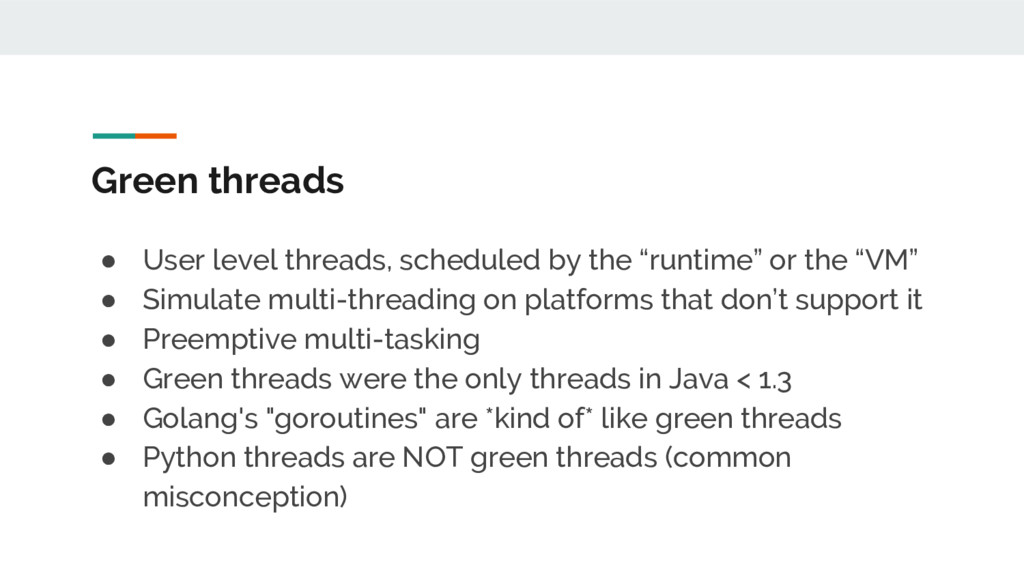 or the “VM” • Simulate multi-threading on platforms that don’t support it • Preemptive multi-tasking • Green threads were the only threads in Java < 1.3 • Golang's "goroutines" are *kind of* like green threads • Python threads are NOT green threads (common misconception)