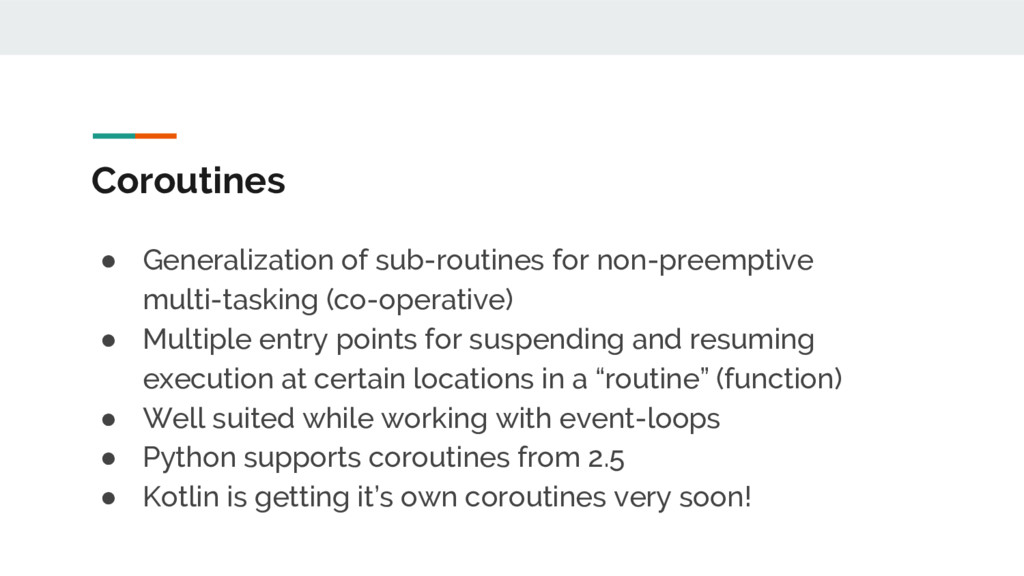 Multiple entry points for suspending and resuming execution at certain locations in a “routine” (function) • Well suited while working with event-loops • Python supports coroutines from 2.5 • Kotlin is getting it’s own coroutines very soon!