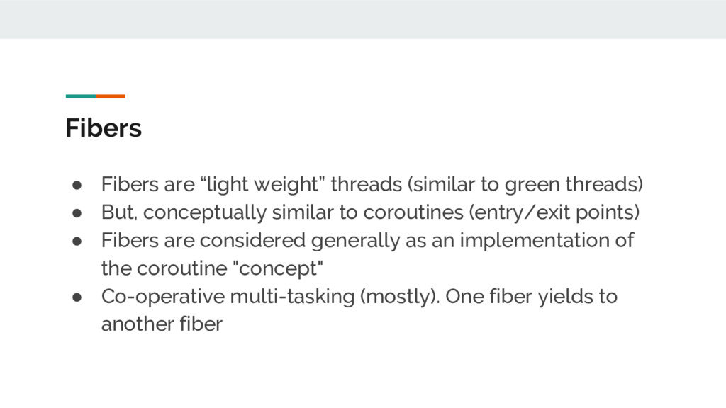 threads) • But, conceptually similar to coroutines (entry/exit points) • Fibers are considered generally as an implementation of the coroutine "concept" • Co-operative multi-tasking (mostly). One fiber yields to another fiber