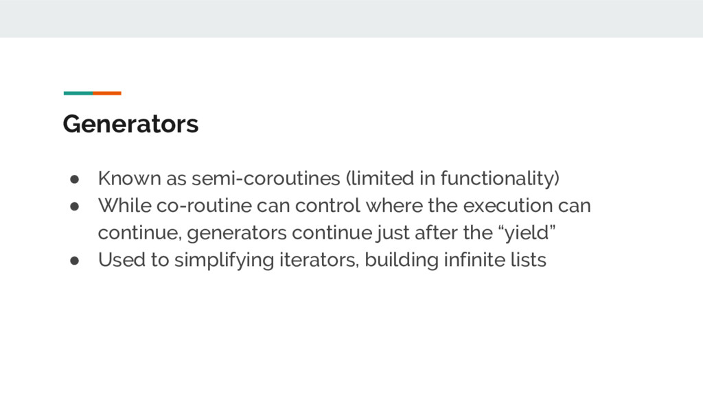 co-routine can control where the execution can continue, generators continue just after the “yield” • Used to simplifying iterators, building infinite lists