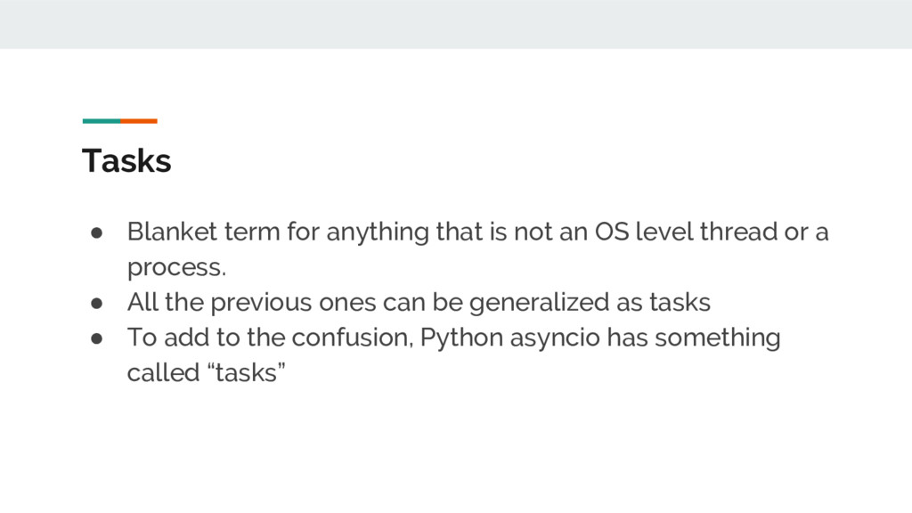 OS level thread or a process. • All the previous ones can be generalized as tasks • To add to the confusion, Python asyncio has something called “tasks”
