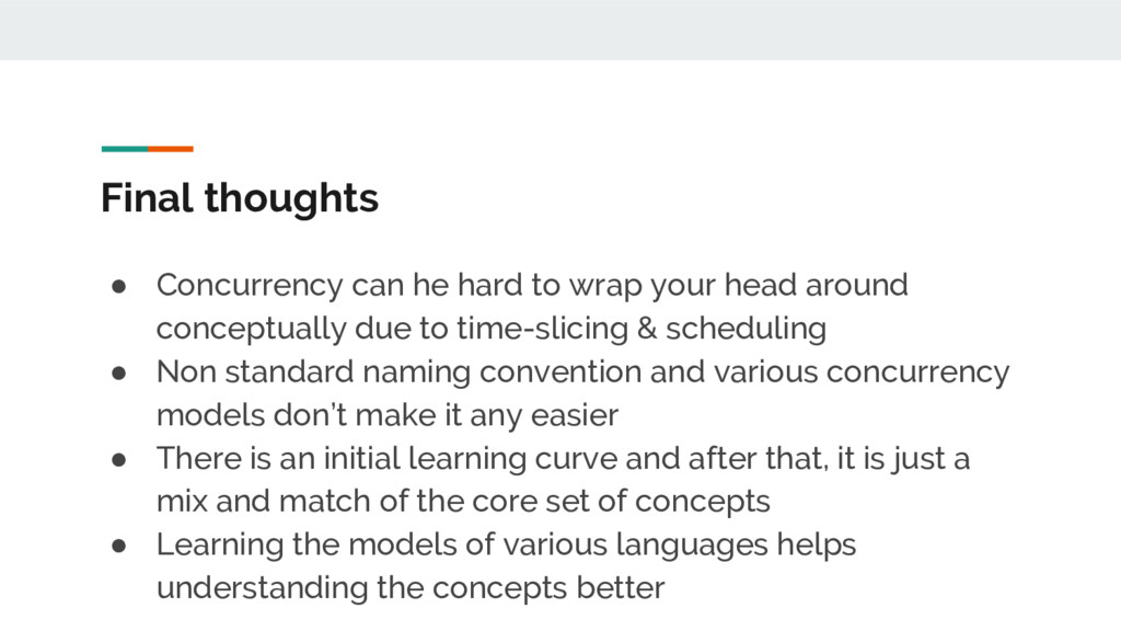 head around conceptually due to time-slicing & scheduling • Non standard naming convention and various concurrency models don’t make it any easier • There is an initial learning curve and after that, it is just a mix and match of the core set of concepts • Learning the models of various languages helps understanding the concepts better