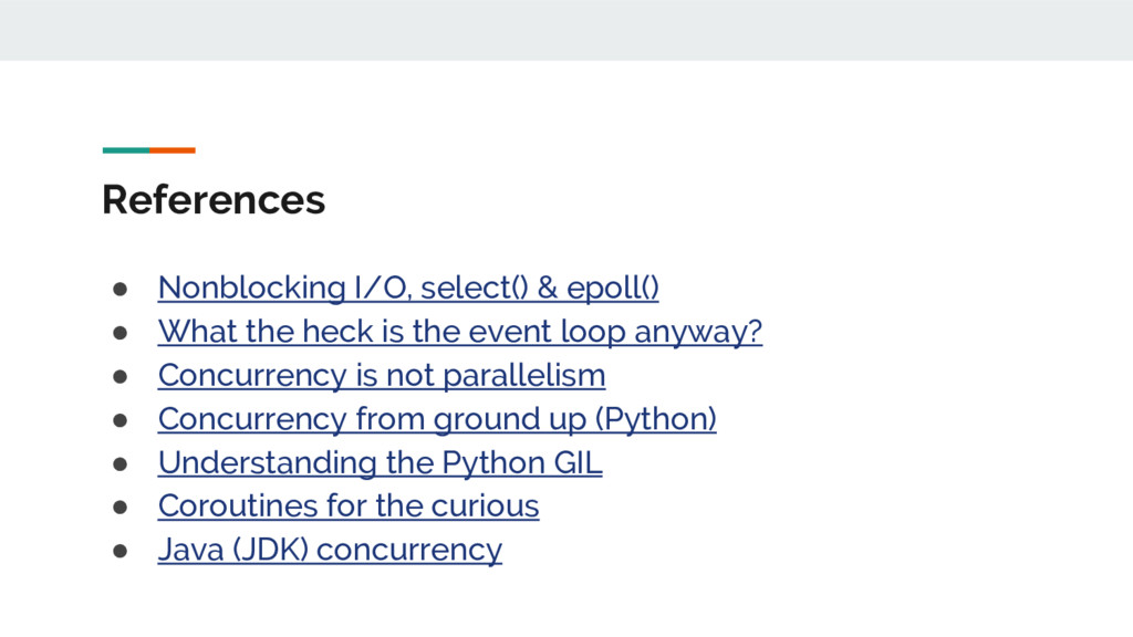 heck is the event loop anyway? • Concurrency is not parallelism • Concurrency from ground up (Python) • Understanding the Python GIL • Coroutines for the curious • Java (JDK) concurrency