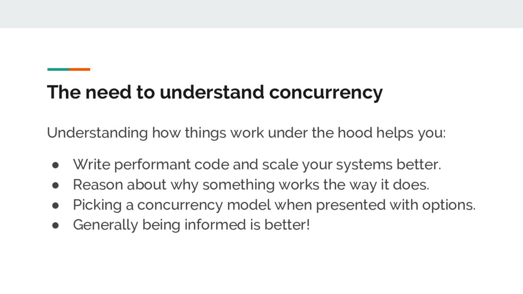 the hood helps you: • Write performant code and scale your systems better. • Reason about why something works the way it does. • Picking a concurrency model when presented with options. • Generally being informed is better!