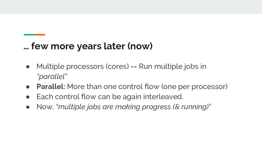 == Run multiple jobs in “parallel” • Parallel: More than one control flow (one per processor) • Each control flow can be again interleaved. • Now, “multiple jobs are making progress (& running)”